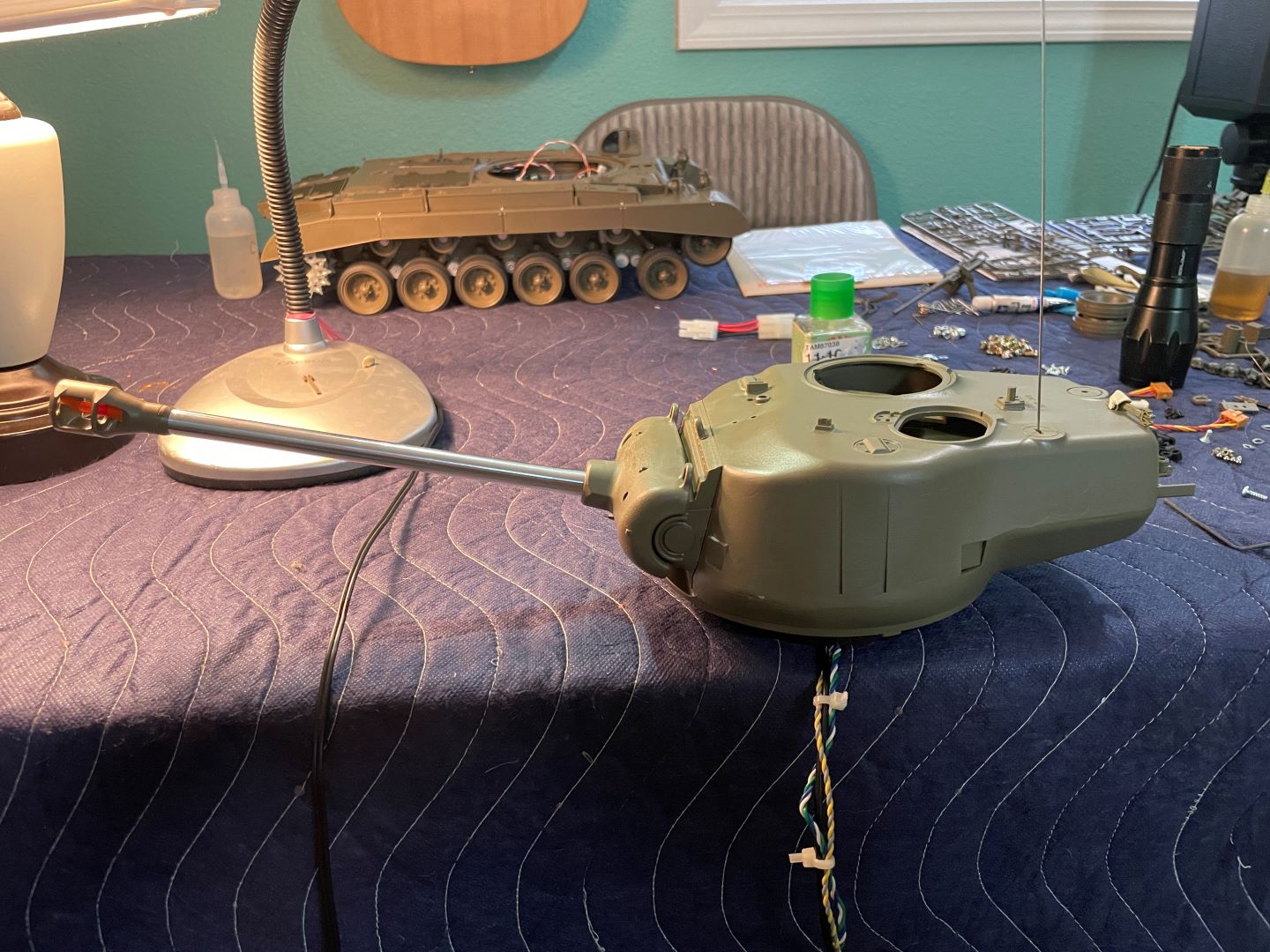 Steps 43, 44, 45 and part of 47. Hooking up the recoil adjuster arm and gun barrel spring was a challenge for me, but we got it. Things are progressing and as I have heard and experience throughout the years, Tamiya parts just fit right! Getting ready to order tracks and controller/mf units.