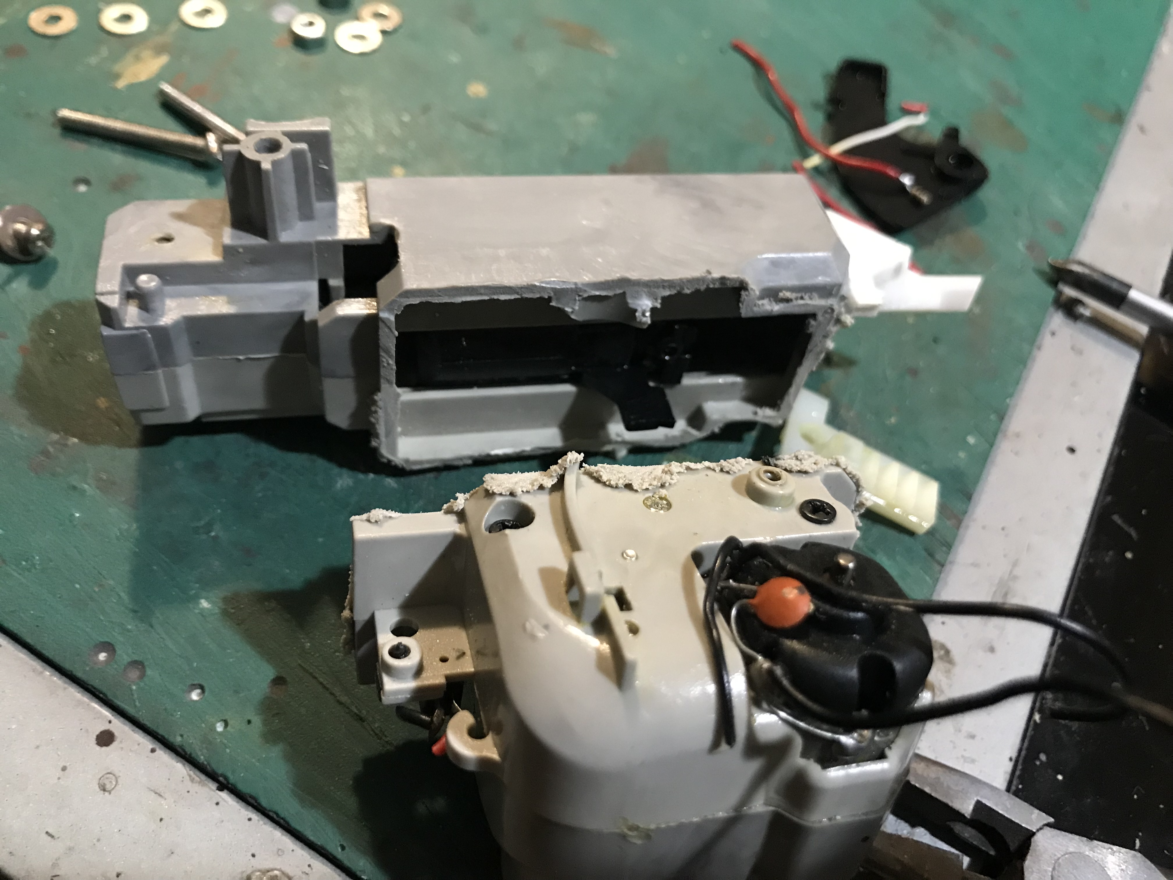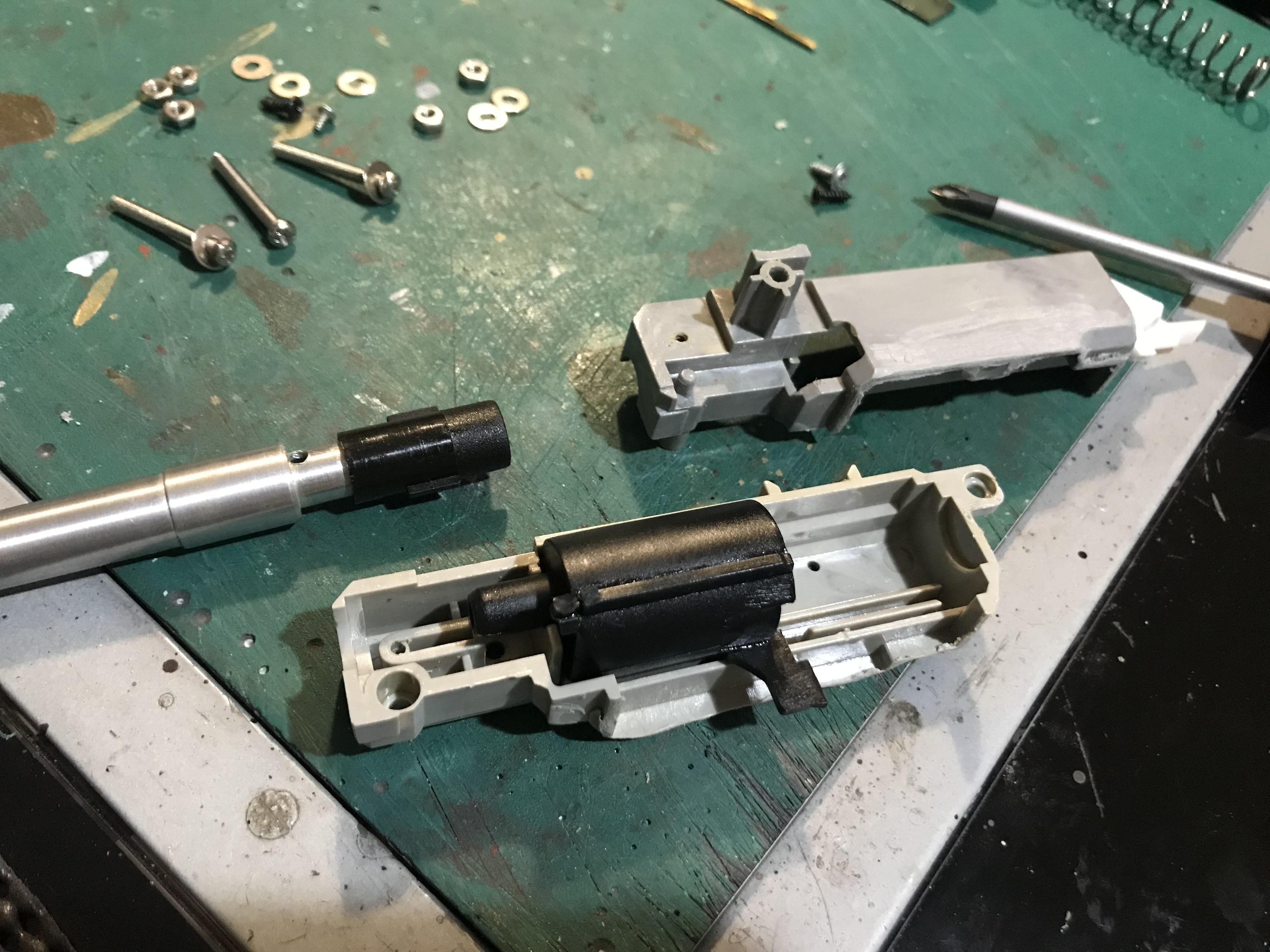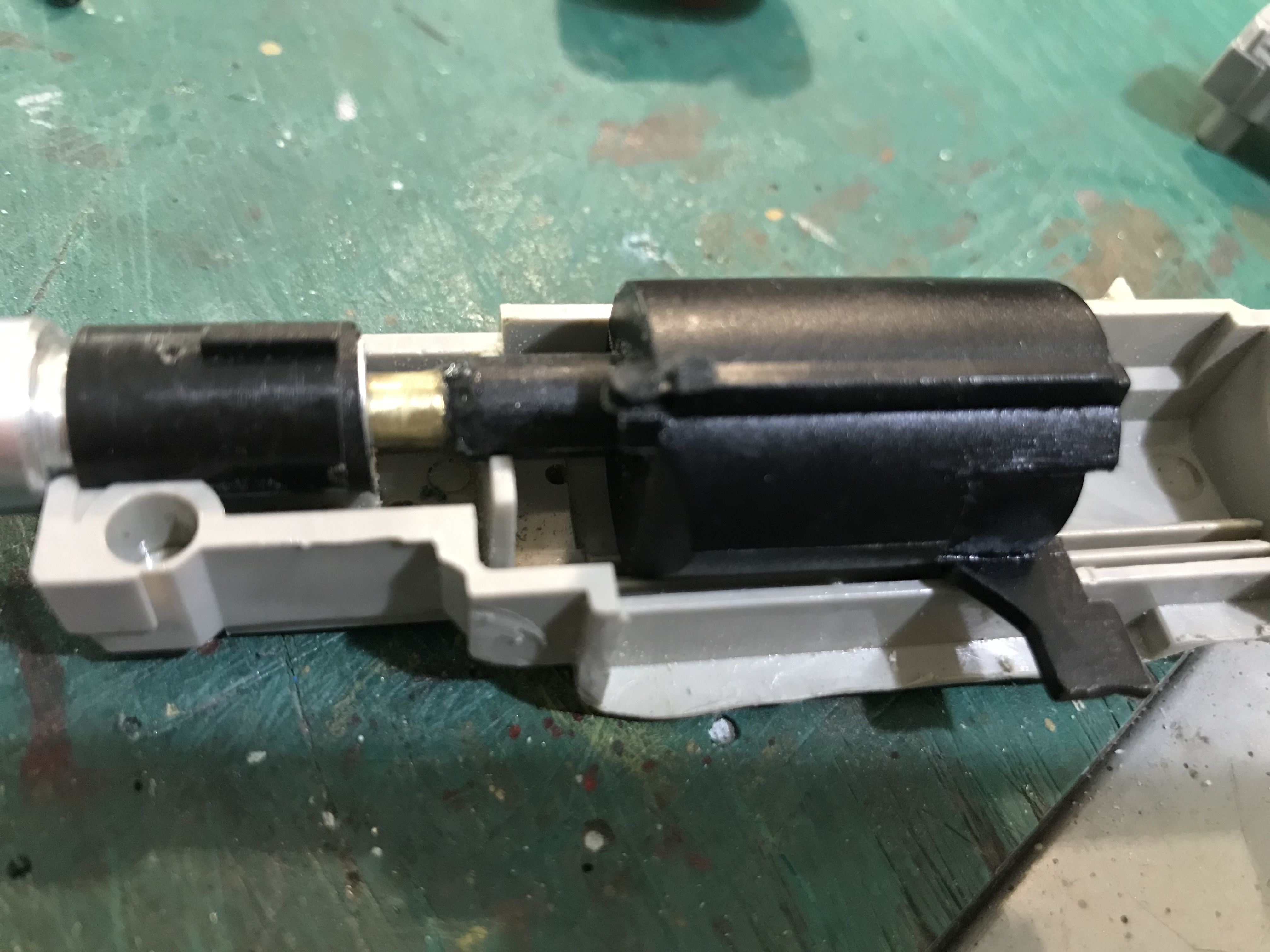 The carnage of removing the BB mechanism behind me, I came up with a plan on how to use the basic functionality of the remnants to use as a recoil system, and preserving the pre-made mounting that Mr Raminator had already made to get it into the resin An-Bri casemate.