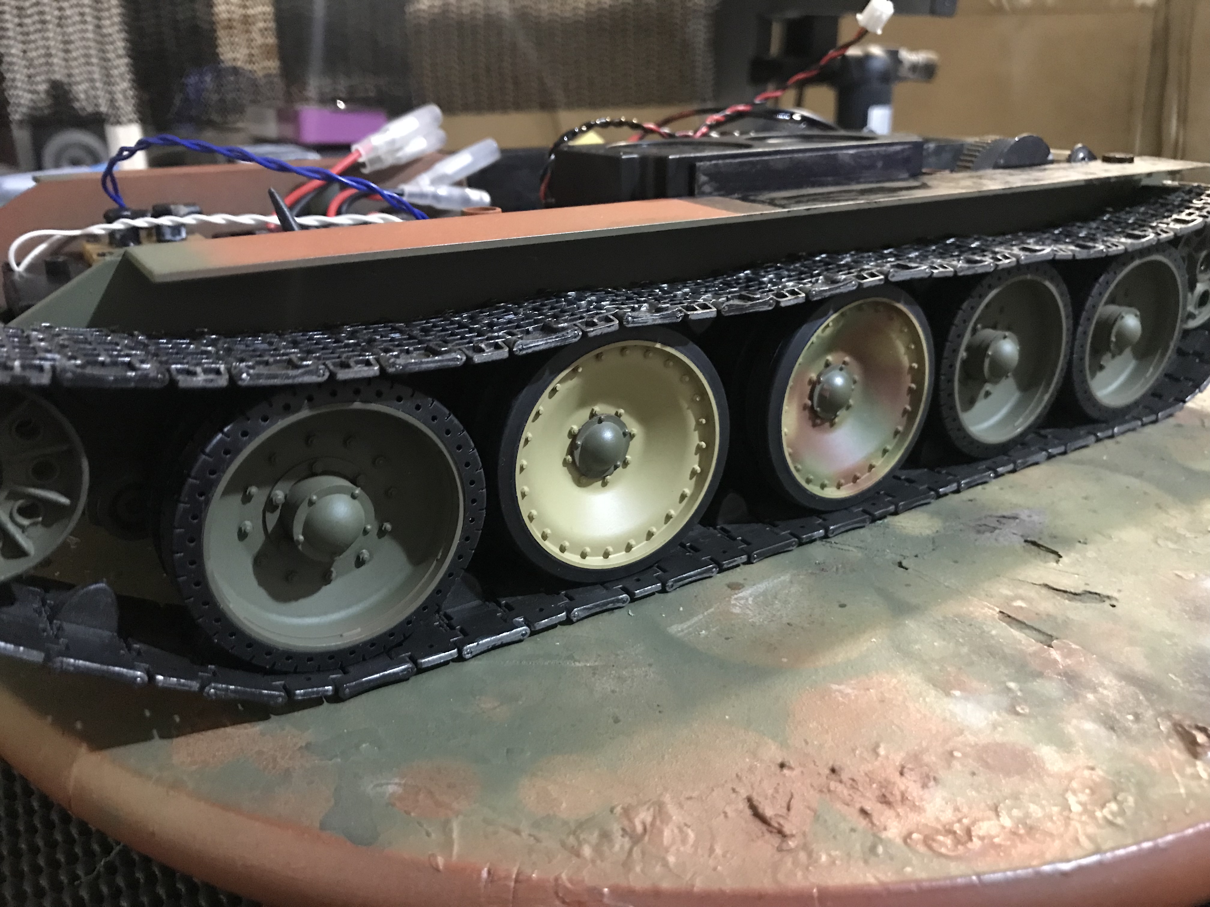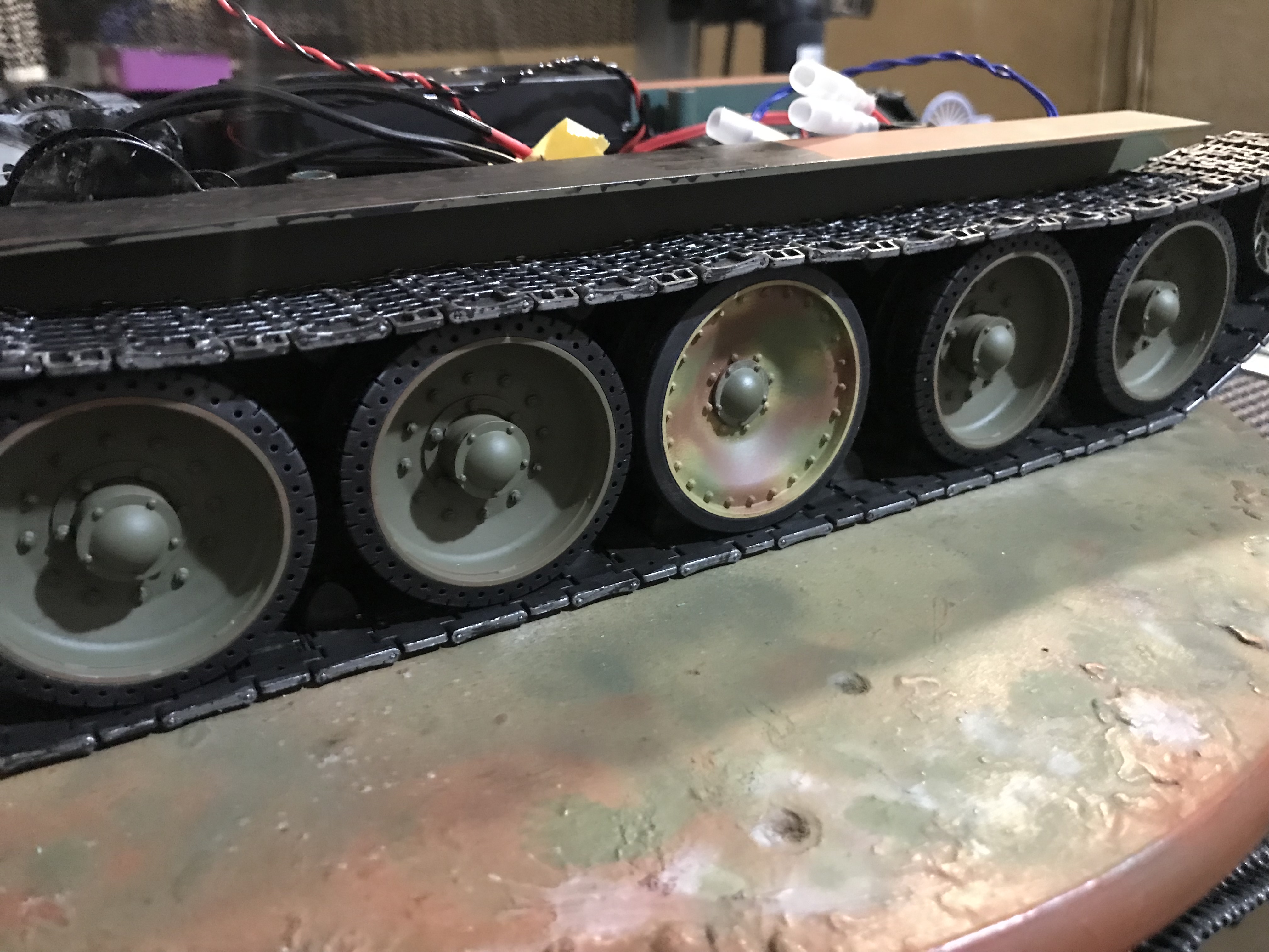 Excellent work fitting the Panther wheels, it's a really unique look. Perfect for a war-weary machine beaten half to hell and back! Let me know if the different rolling diameters are a problem, I'll print some replacement tyres that match the Panther's. If you get me the inner diameter of the Panther hubs, I can do you some T-34 hubcaps to suit them too. It looks like they project out some distance from the Panther wheel, they must be attached to the T-34's wheel hub.