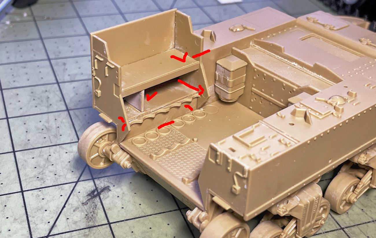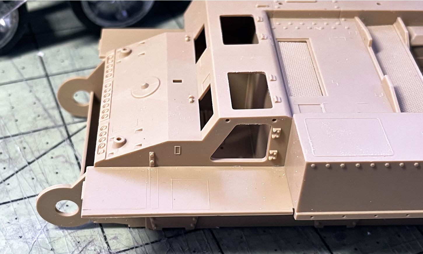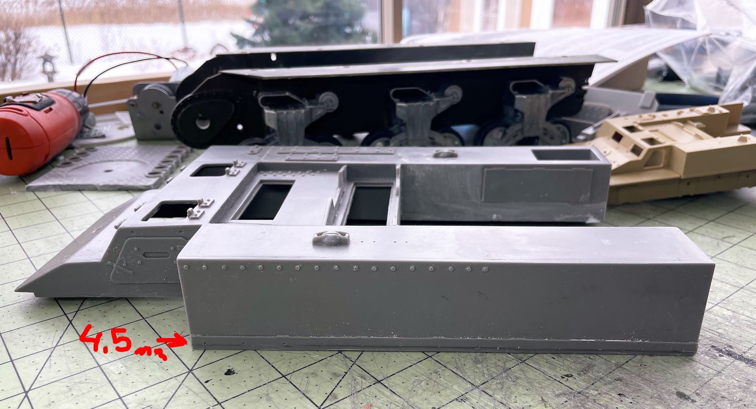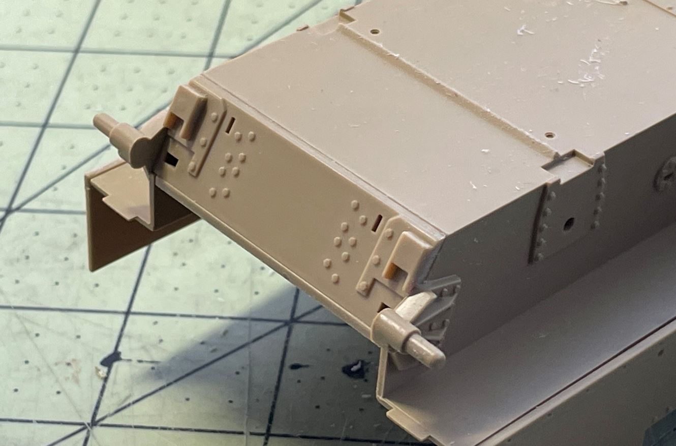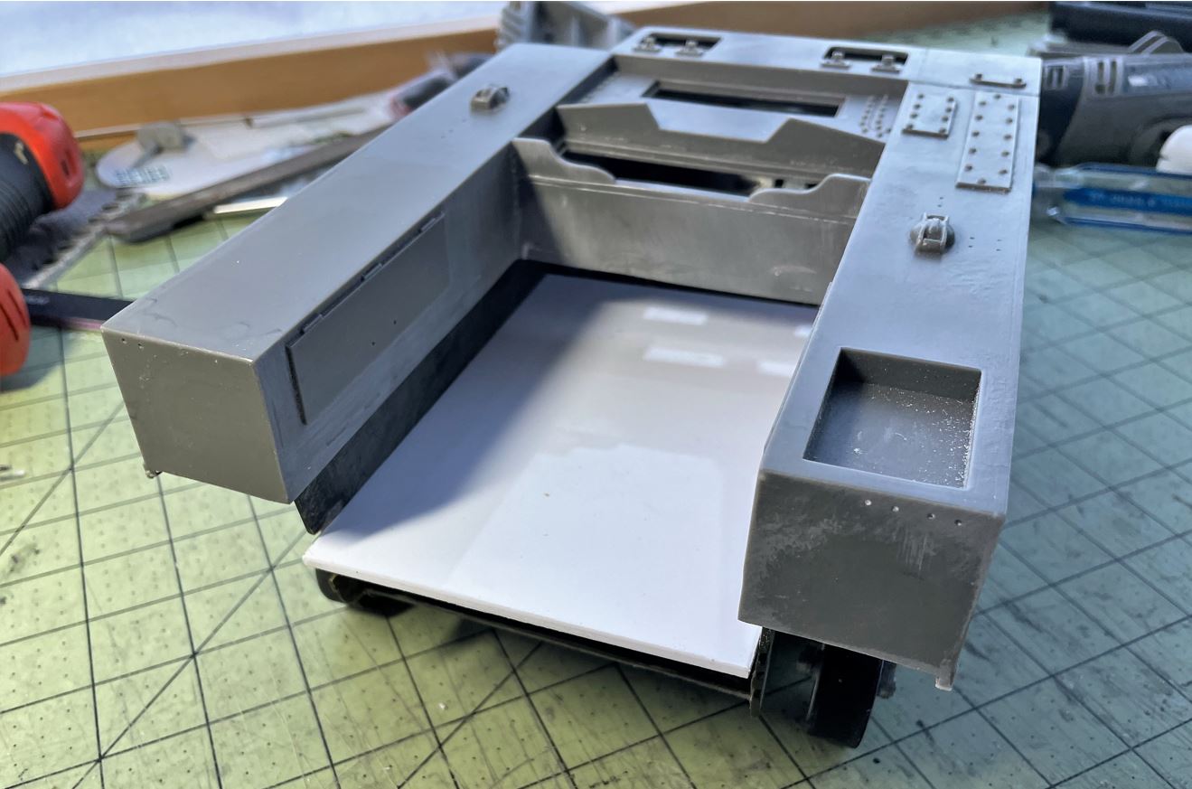 The rear of the vehicle is cut. I removed about 4mm in length from the Vandra upper hull at the back. This makes it more in line with measurements of the 1/35 kit and aligns with the fighting compartment deck. The bottom rear plate is prepared to have the idler adjusters installed.