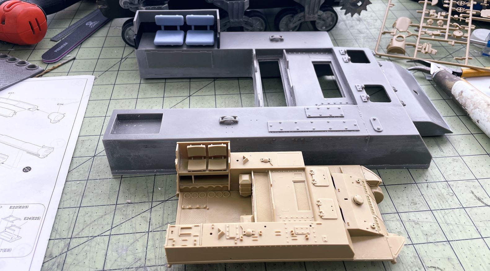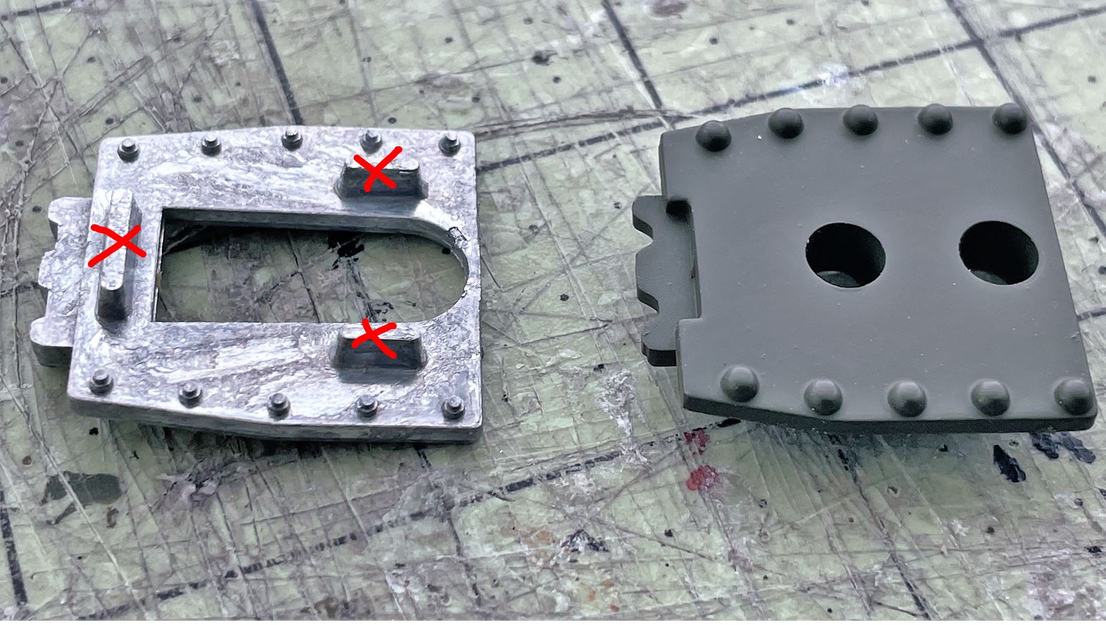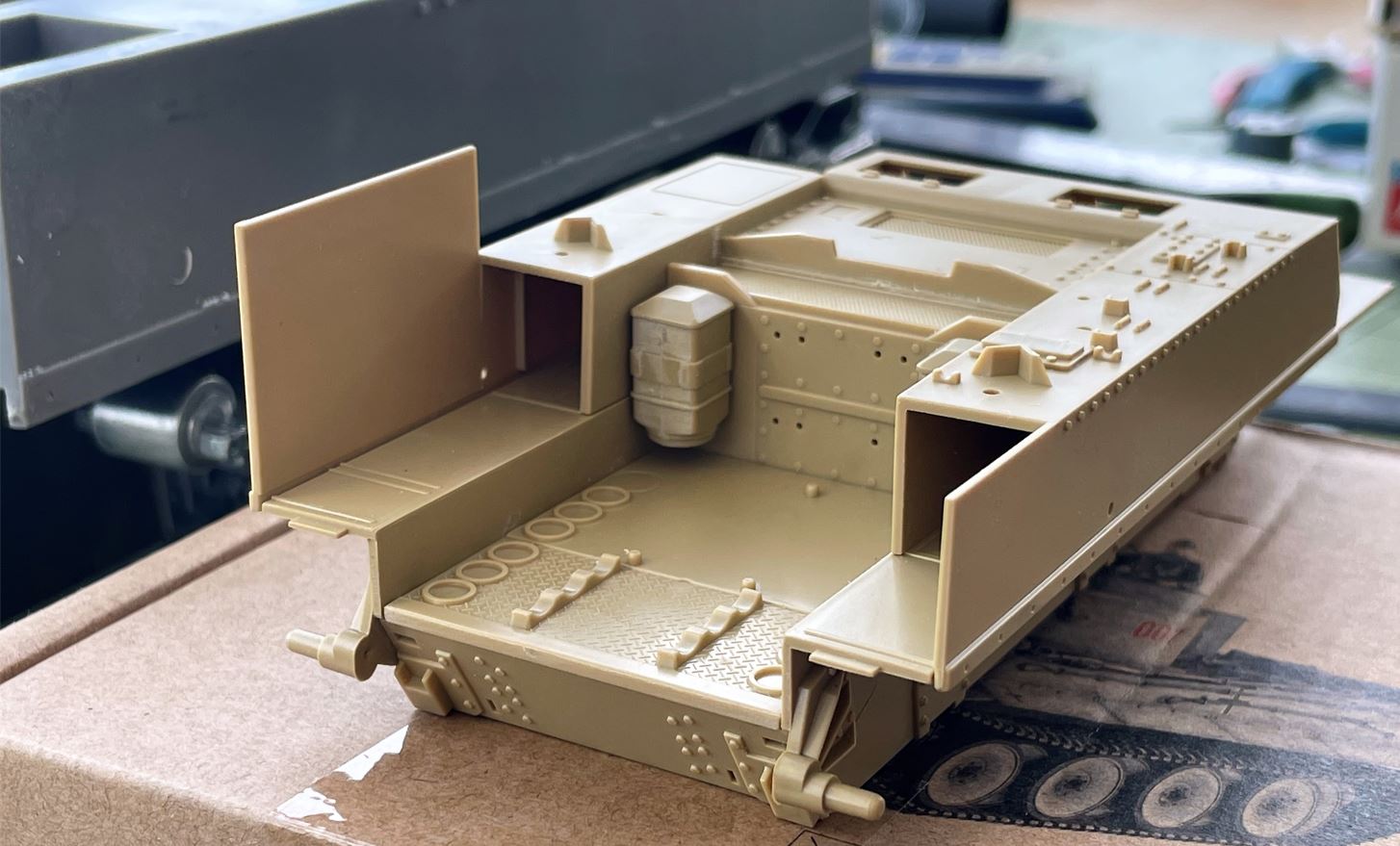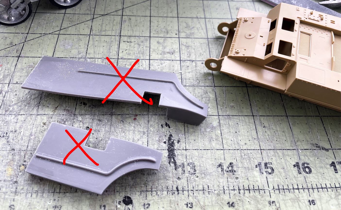 The rear of the vehicle is cut. I removed about 4mm in length from the Vandra upper hull at the back. This makes it more in line with measurements of the 1/35 kit and aligns with the fighting compartment deck. The bottom rear plate is prepared to have the idler adjusters installed.