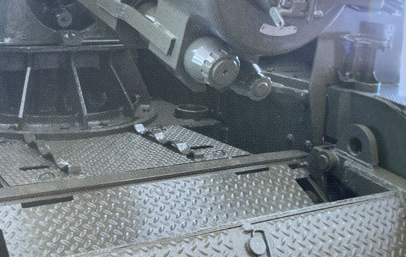 The left side crew seating area is hollow, with storage under the seats. The seats level are lower than the top plate. There are also triangular plates that protrude inside. The floor is lower. The ammo rounds are places on top of the deck floor, and not inside it. There are ammo stands on the sides. Engine air filters at the front. The floor thread plate is partial and of a single diamond pattern.