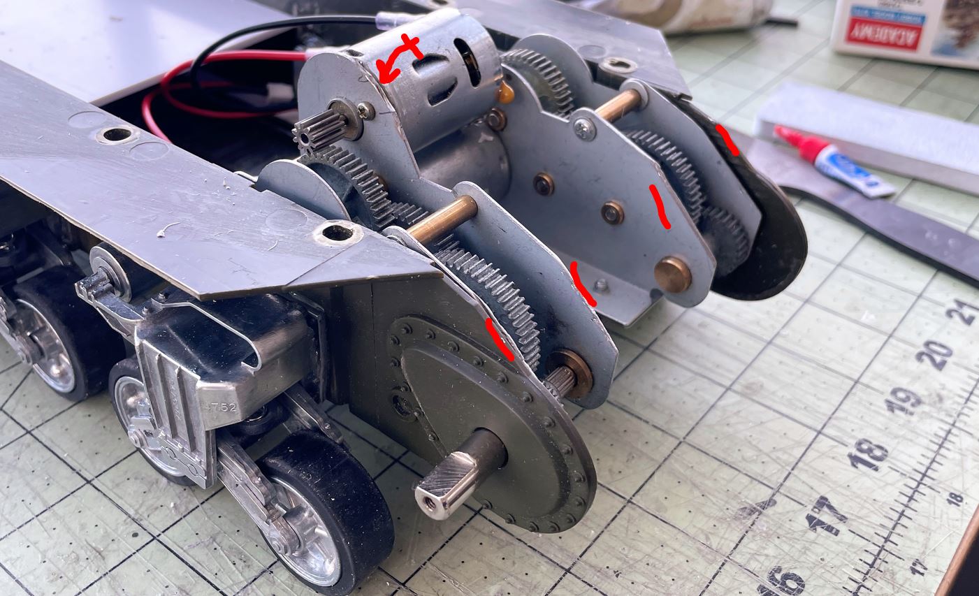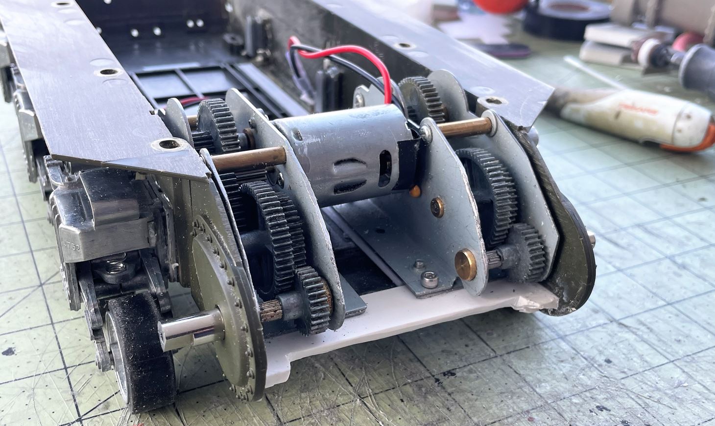Searching through the junkyard, i found an old Heng Long Panzer III/IV gearbox with metal gears, good enough for an M12. Likely some leftover from another conversion years ago. I did a limited refurbishment of the gearbox by replacing the old motors by less older ones, replaced the old torn wires, replaced the tiny type 104 capacitors by new ones, added a third capacitor between the + and - poles. Tests show it is working well, a lot more responsive at low speed. I had to remove 3mm from the main shaft to align the sprockets with the roadwheels, a 1 minute cut with a metal saw and some filing.
