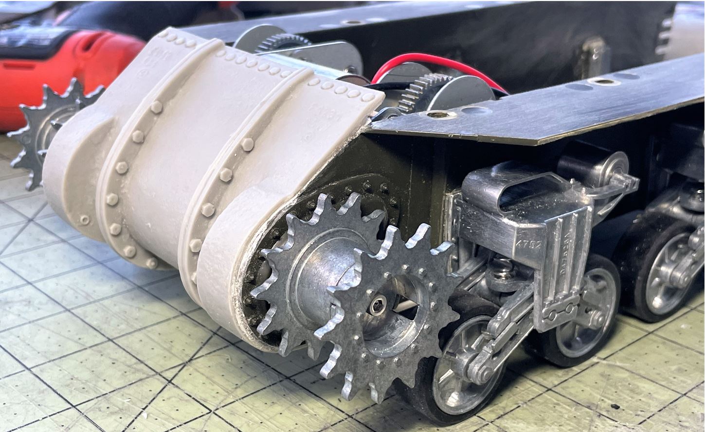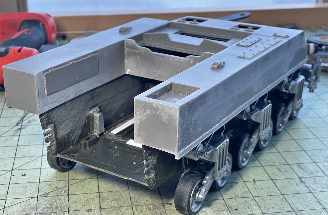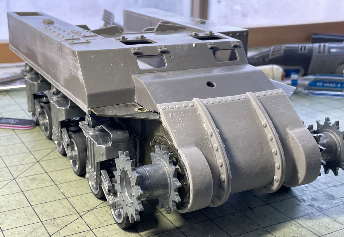 The three piece transmission cover provided by Vandra is installed, one of the thing they do well. I know its shape was adapted to fit the Heng Long gearbox and the RC Sherman lower hull. It is out of scope of this project to do anything about it that would make this part more accurate.