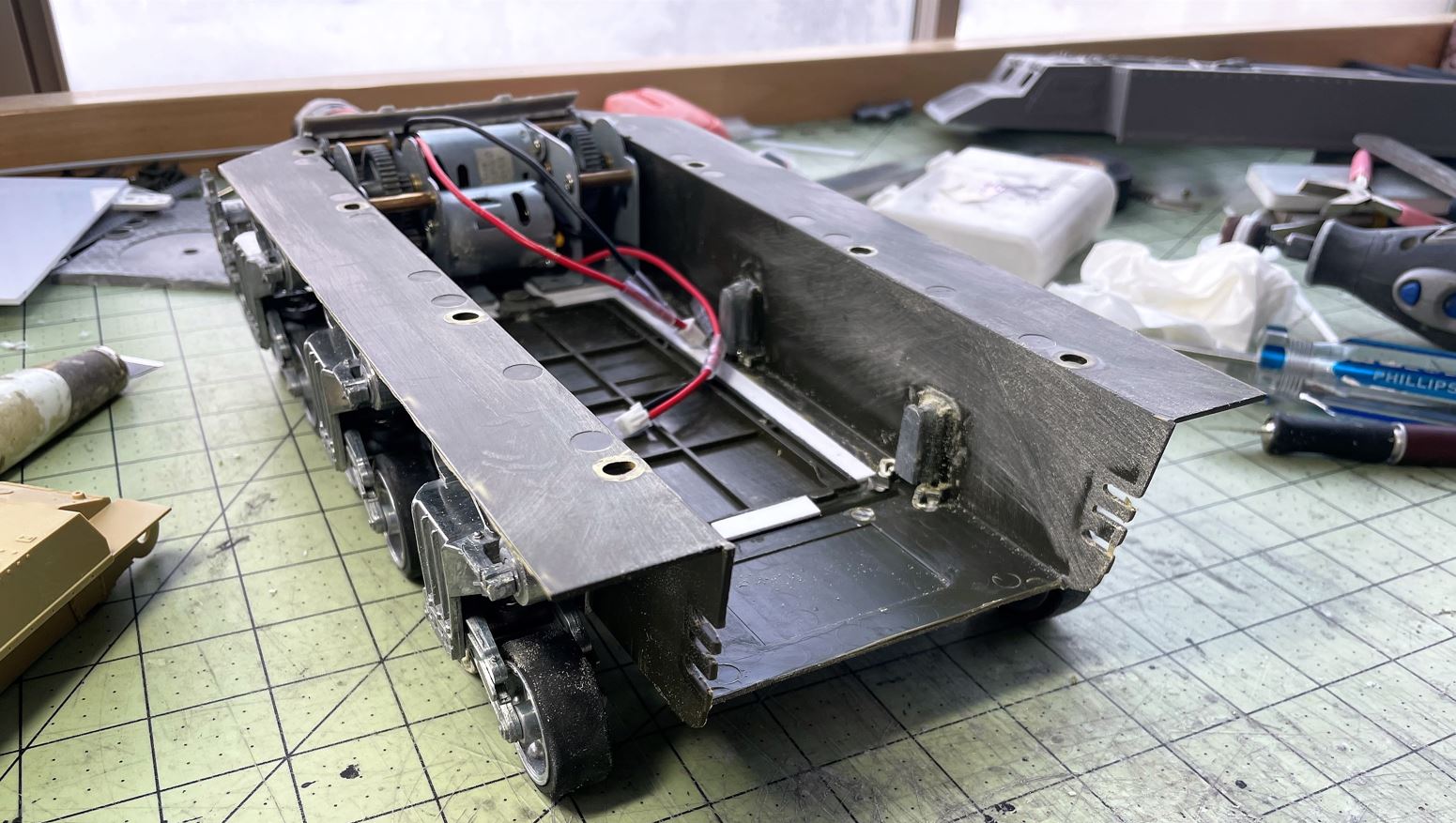 Gearbox installed on a 3mm plasticard support base glued earlier to the bottom of the hull. Reinforcement added to the front, providing support for that gearbox screw and also support for the long side covers. The fit of the Heng Long gearbox inside the Mato M4A1 hull is extremely tight. I had to do some surgery by removing anything that was in the way.