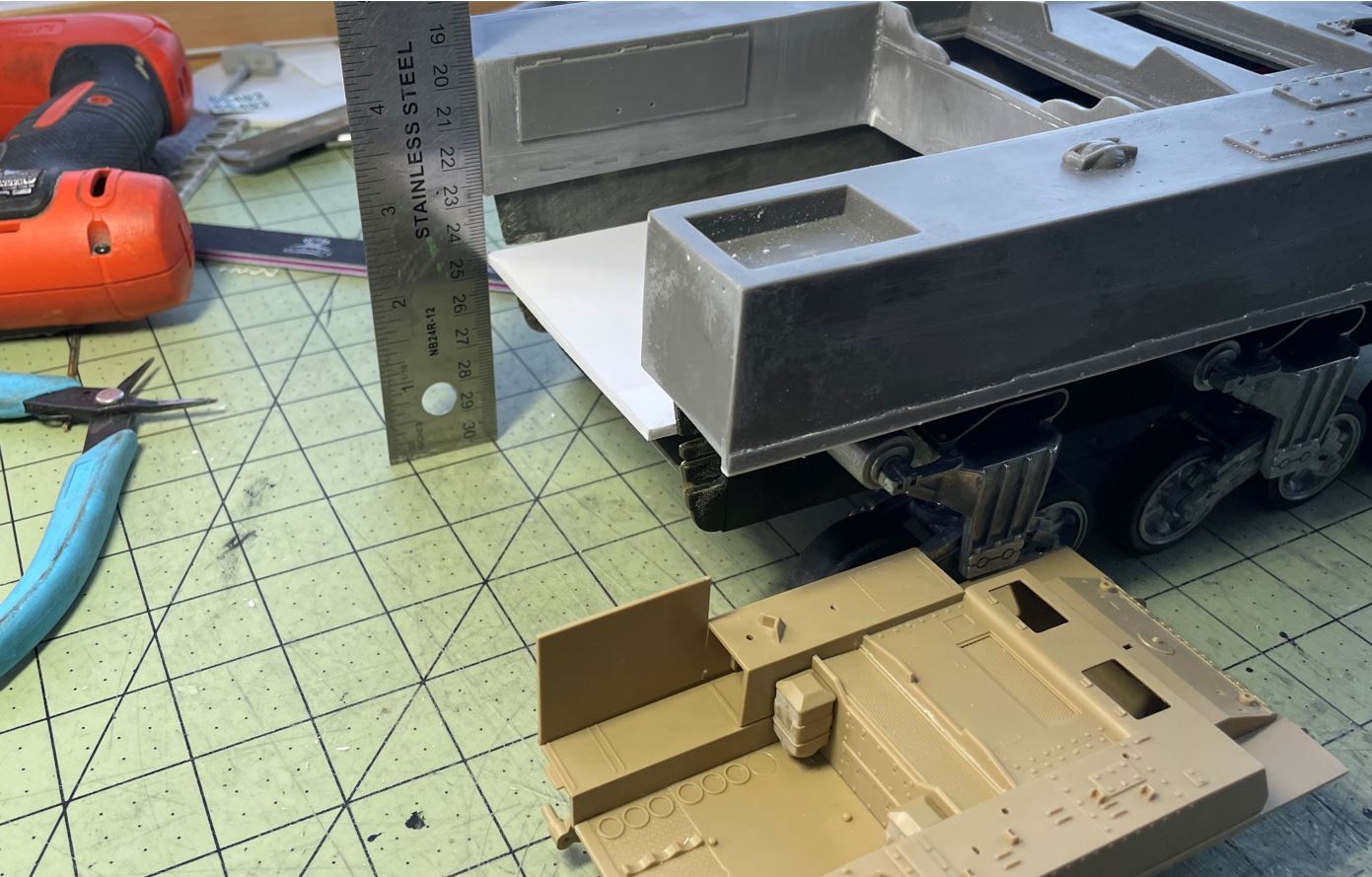 Dry fitting the new lower base for the howitzer and doing some calculations and planning for next steps. The rear is vertical down to the base, and then angled towards the inside. The 1/35 kit will provide the specs because there is very limited info on the rear of the M12, the rear blade is pretty much hiding the bottom of the hull in that area, its not showing on any picture.