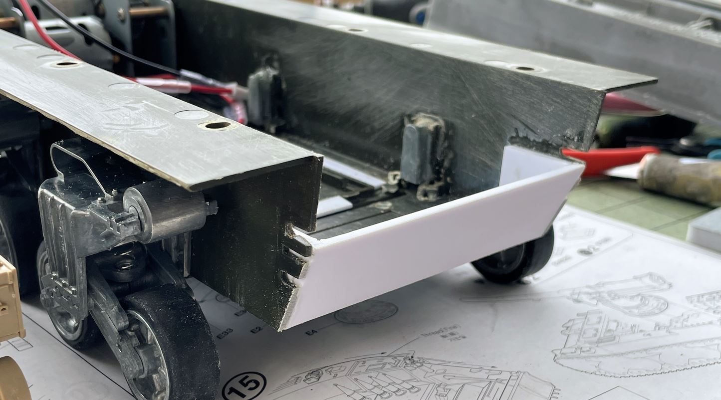 The M3 Lee fenders that Vandra provided for the M12 need to be discarded. References show no embossed stiffeners on them, and the ugly squared holes meant to go around screws for the transmission cover don't fit my project. These fender parts will be replaced by a flat plasticard section of a thickness to be determined.