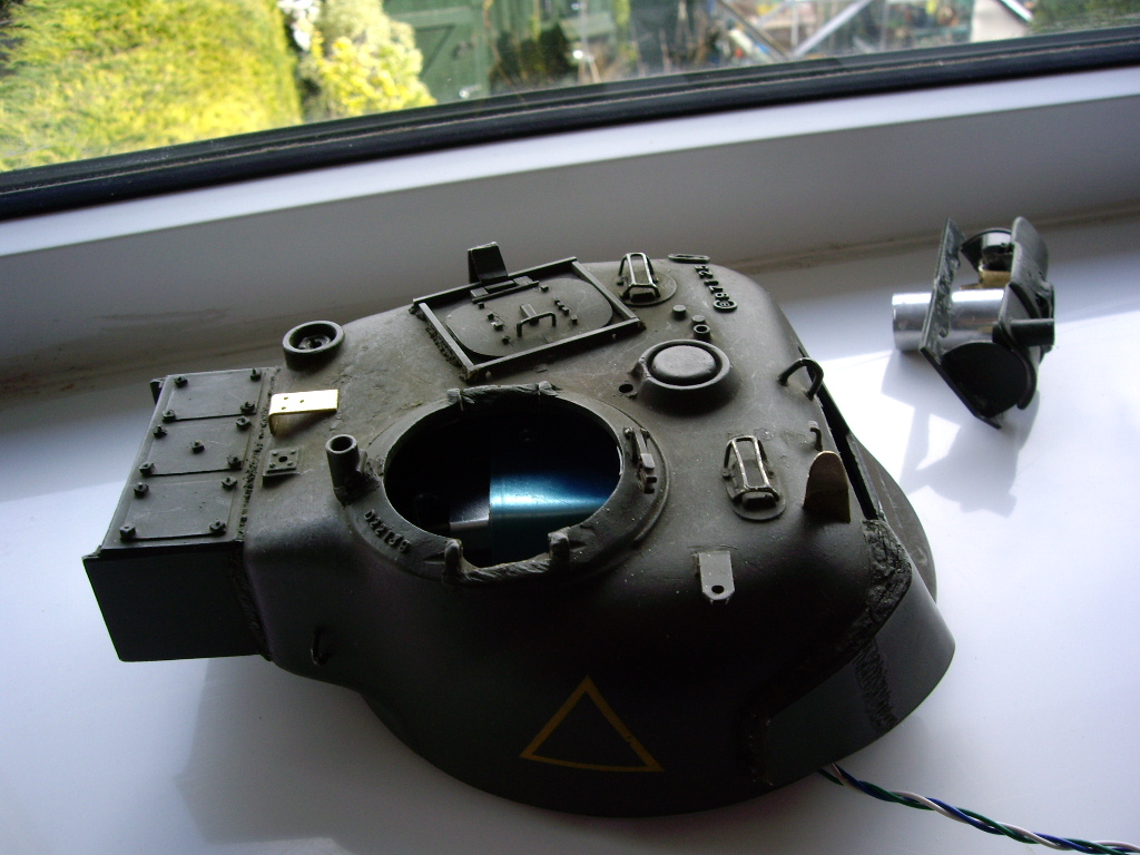 so we move forward ......the mantlet the hole opened up by another 4mm this to bring it back where it should be,,,the recoil is a tiger 1 type as yet un modified, you must bear in mind that this is the old type turret and is slightly smaller at the bottom, the new turret is 2mm wider .