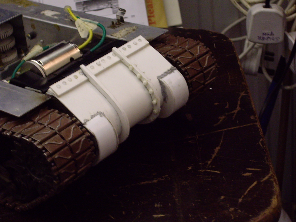 this shows the finished vvss covers and finished wheels note also the fact that i have brought out he centre part to be almost level with the sprockets as they should be this was done by adding some 15mm copper pipe to the nut plate and a push fit was sufficient to hold it in place.........