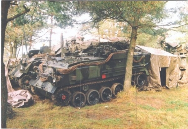Found another piccy of my old ride before we renamed her and painted tiger stripey. Hope fully give you an idea of colours. This is a late mark 436, so has the extra comms boxes on the sides and a stowage cage over the mortar hatches. Must of been shortly after an inspection as the paint looks very intact and regulation. There are 4x 43's here in pairs and back to back all linked by a tented corridor to form the Brigade HQ.