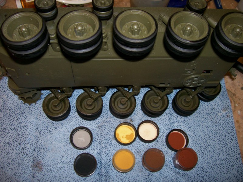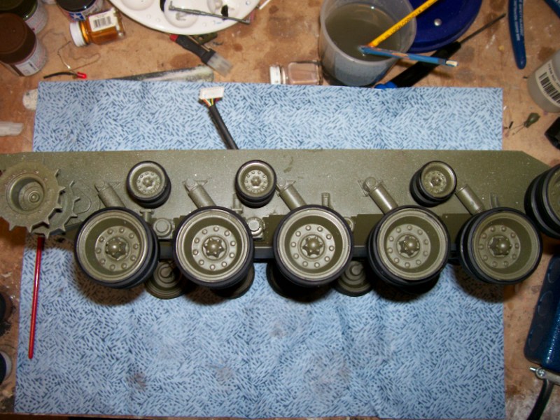 Now that the tank was completely painted in drab from head to toe I painting items that arent supposed to be green. First up was the idlers rubber coating. These were easy with a small brush and flat black.