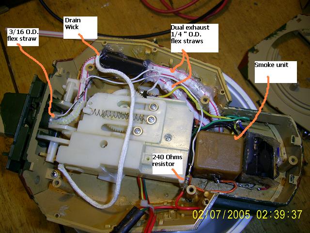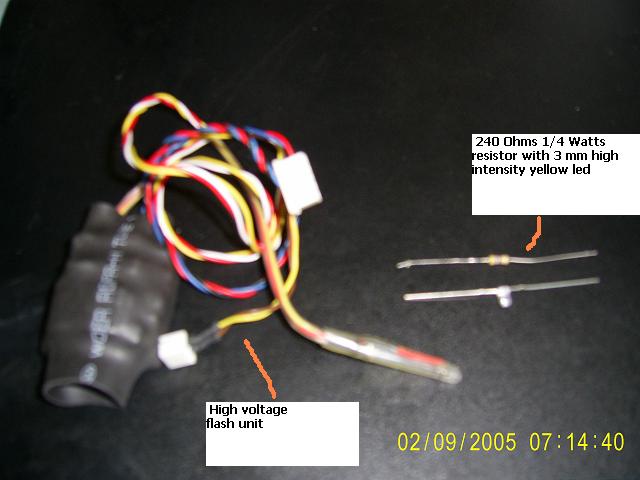a pipe system ( made of 1/4 " O.D. and 3/16 " O.D. flex straws ) , a 240 Ohms 1/4 Watts resistor in line with a 3 mm high intensity yellow led ( to replace the high voltage flash unit ) ...