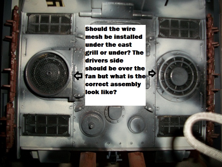 Would you possibly have a picture of the Jagdpanther's two cooling rear fans,the question I need answered is the mesh grills and their proper installation either on top of the assembly or above the fan yet below the top area.