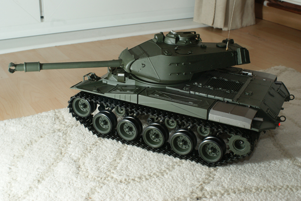 It doesnt have the smoking barrel as the blurb says but does come with BB's, smoke oil, instructions, plastic detail parts, decals, a 2000mah battery and charger. Its been charged and run in the house to the annoyance to our two dogs who dont like it. The Boarder Terrier absolutely hates it lol, but i havent tried the BB gun as yet.