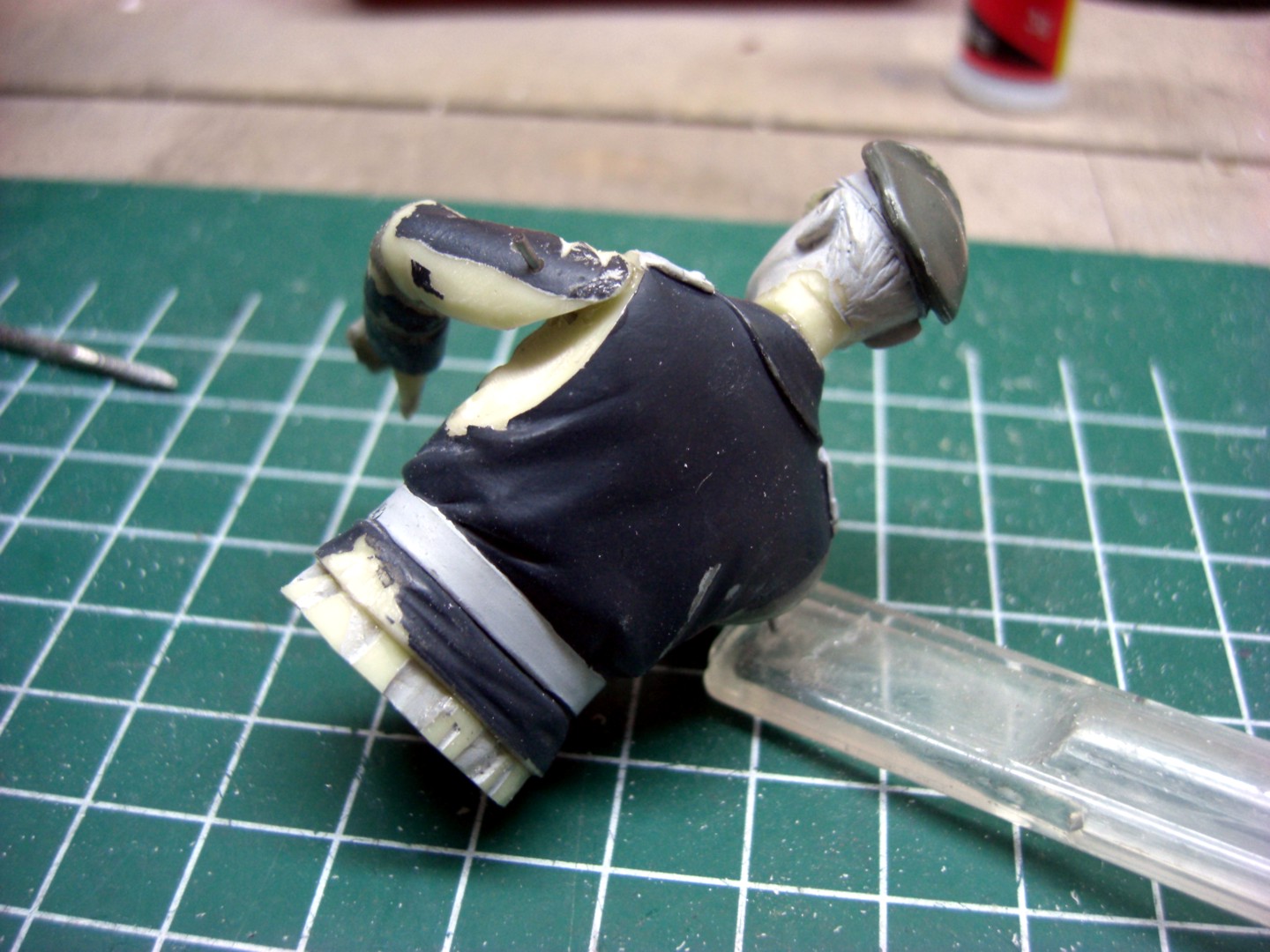 All fractures are fixed with wire, then patched and modeled with Apoxie Sculpt. In the right hand he should hold the switch from the headset and with his left hand he should hold at the turret ring.