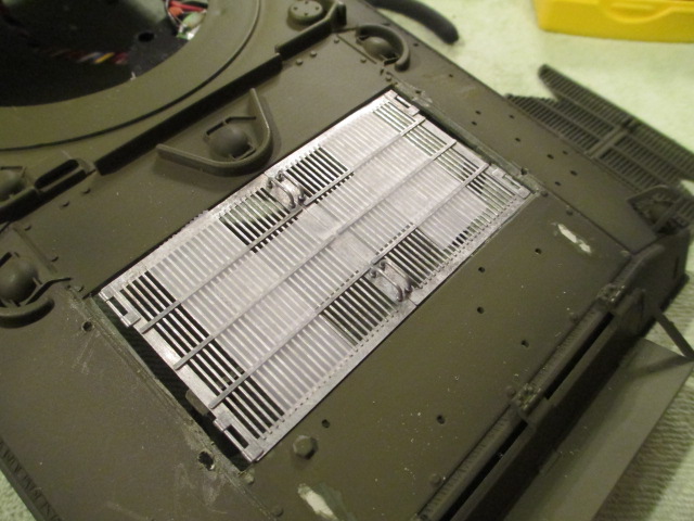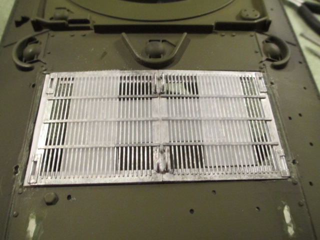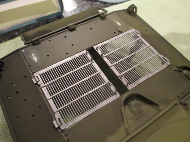 12th Day: Yes indeed, the 'Jerry' cans need three handles. Before I paint those, I will add a third bar made out of a heavy duty staple. Another parts shipment arrived, the Tamiya sprue of stowage gear from JR-RC's and the Taigen 2.4 GHz TX\RX\Speaker combo from Forgebear. Beautiful stuff and highly useful to my build. Tonight, I wanted to return to the engine bay doors and fix the spacing issue and also see if mesh or a center brace was required on them. The method of repair for the spacing was to build a rim of flat plastistruct around the inside of the engine bay for the doors to rest on. Research on existing tanks and from wartime pictures showed no center brace or mesh. Rather, the underside of the doors was louvered and there were two deep engine air dams under those. No space exists in my Sherman for those so I was satisfied with installing the rim and fixing the gaps. Pictures: