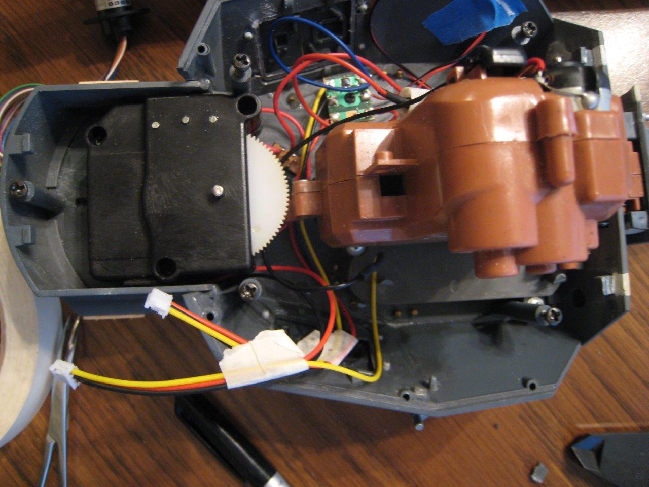 360o turret. I always wanted one of these. I saw several innovative ways of doing it a few years ago, but couldn’t replicate it. Then, I finally saw Max-U52's video posted on RCU about how he installed Taigen’s setup. I figured I could do that. I used a 12-wire setup because I couldn’t find an 8-wire setup. I needed 3 wires for the LEDs, 3 for the gun and elevation, and 2 for the airsoft gun sound-and-recoil trigger. If you have an antenna in or on the turret, you would need an additional wire. I don’t know how many, if any additional wires going into the turret will be needed with Taigen’s recoiling airsoft gun, but I have room for growth. (Note: Taigen’s setup wouldn’t work because they only provide 7 wires on the slip ring for the setup that supports airsoft and a turret machine gun.) I glued the slip ring into the rotation ring and drilled a ½" hole behind it in the turret floor. The rotation ring’s were made by mating another rotation ring to it and filing out the teeth. It looks a little crude, but the rotation motor and gearbox didn’t seem to notice.