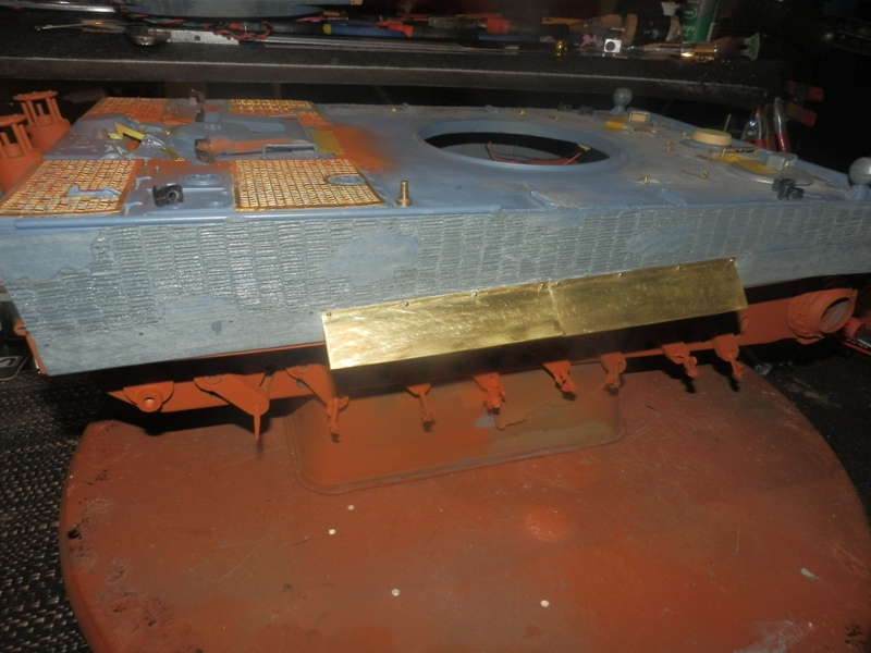Drill those brass 'fenders' for mounting while they are off the vehicle. I learned this lesson reattaching a couple of the ones that came loose during shipping on Jack's Tiger. I figure as or if the others come loose while running, I will drill them and mount with Tamiya hex head screws until they are all down as such. Your Tiger is really coming along, Doc. ;o)