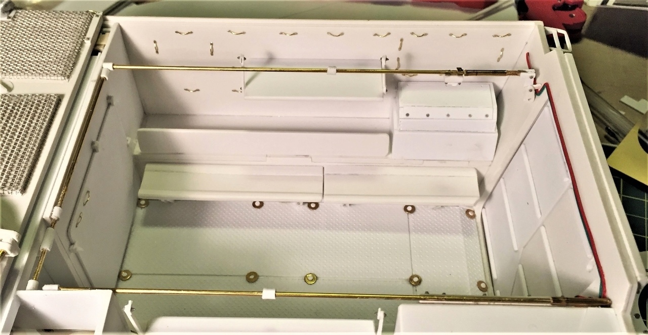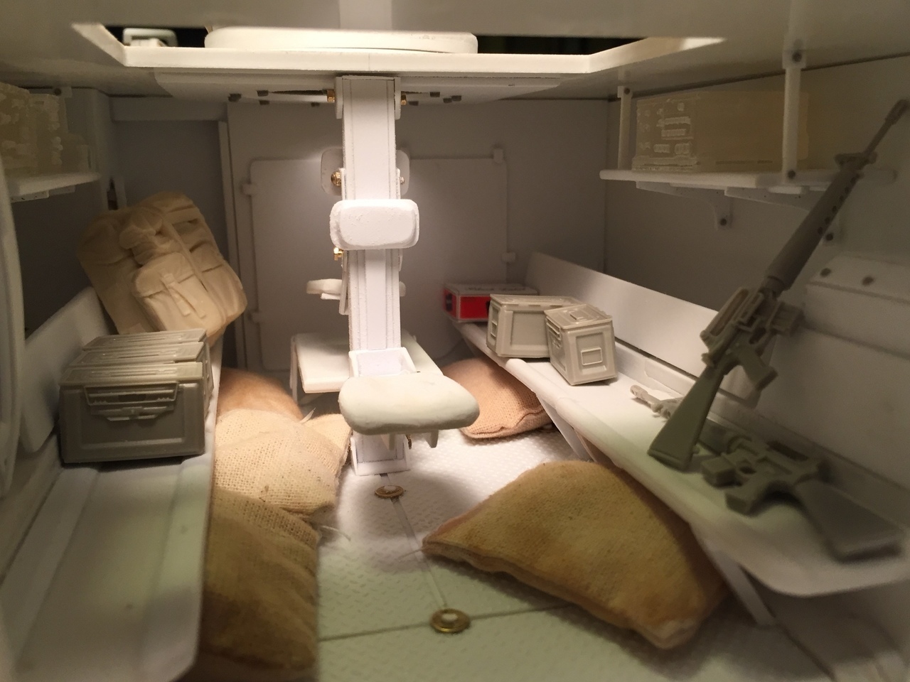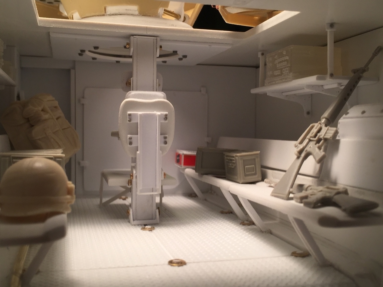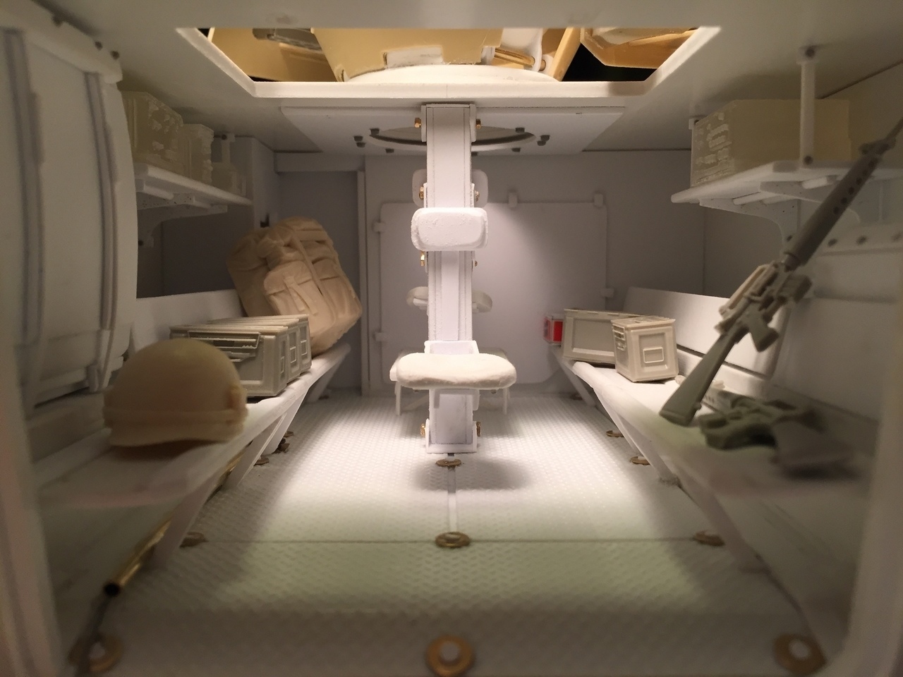 I installed the tubing running through the interior ceiling to the back, in real life connecting to the ramp locking and operating mechanism. The interior will be painted light green (sky).