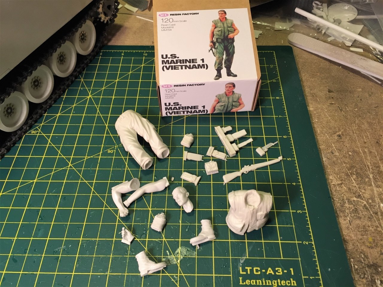 First is the SOL US Marine 1 Vietnam. It is a very interesting figure. He has a flak jacket without shirt underneath, which was very common in the heat of Vietnam and something I was really looking for. The face is also beautifully done. It comes with an M-14 but it won't be used here. He will be my 50 cal gunner/commander and will be positioned in the cupola. He does not have the tank helmet but pictures of M-113 in Vietnam does not show crew member always wearing it.