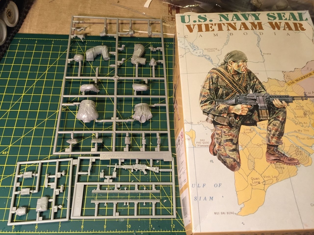 Next are three Dragon 1607 Seal Vietnam figures. A seal of course does not fit in an M-113 but the figure comes in a half kneeling position and with modifications, the parts can be used for a sitting figure. This is important because there is absolutely no US Vietnam or modern sitting figure available. This one at least has the right uniform for the time (minus the tiger stripes of course) and has US Vietnam combat boots. It has some useful accessories but the Stoner assault machine gun does not fit. So, these will be used for the 3 sitting figures, and two torso/head with head bandana will likely be used for the driver and a sitting crew inside.