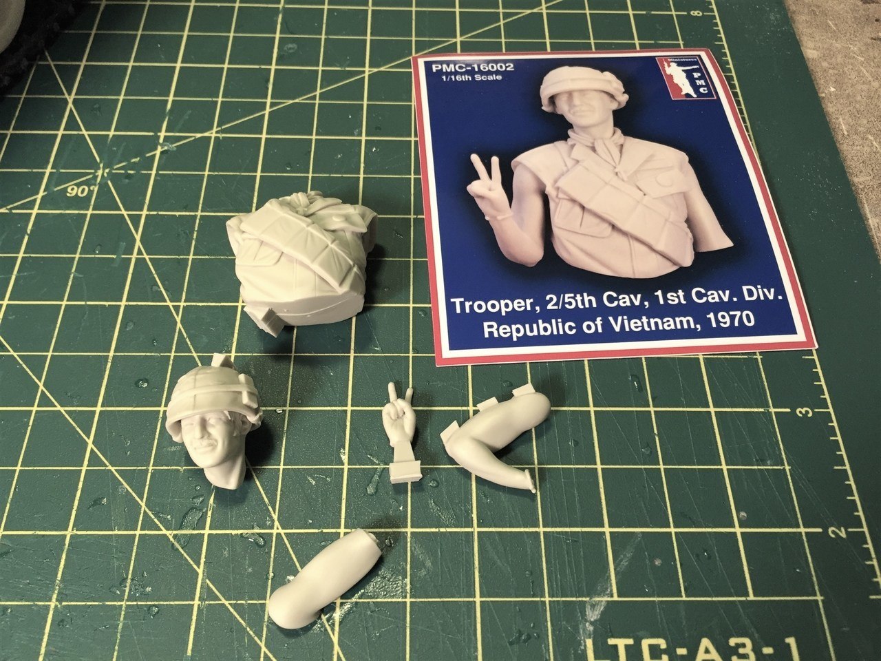 Next is the PMC 16002 Trooper 2/5th Cav, 1st Cav, Vietnam figure. It is just a torso and head. The plan here is to give it a pair of Dragon Seal legs but I am unsure of the results. The figure has a flak jacket without shirt, very good helmet with stuff strapped to it but has no accessories. The peace sign is interesting. The ammo pouch are molded in, not ideal. He will be given an M-16 and other equipment.
