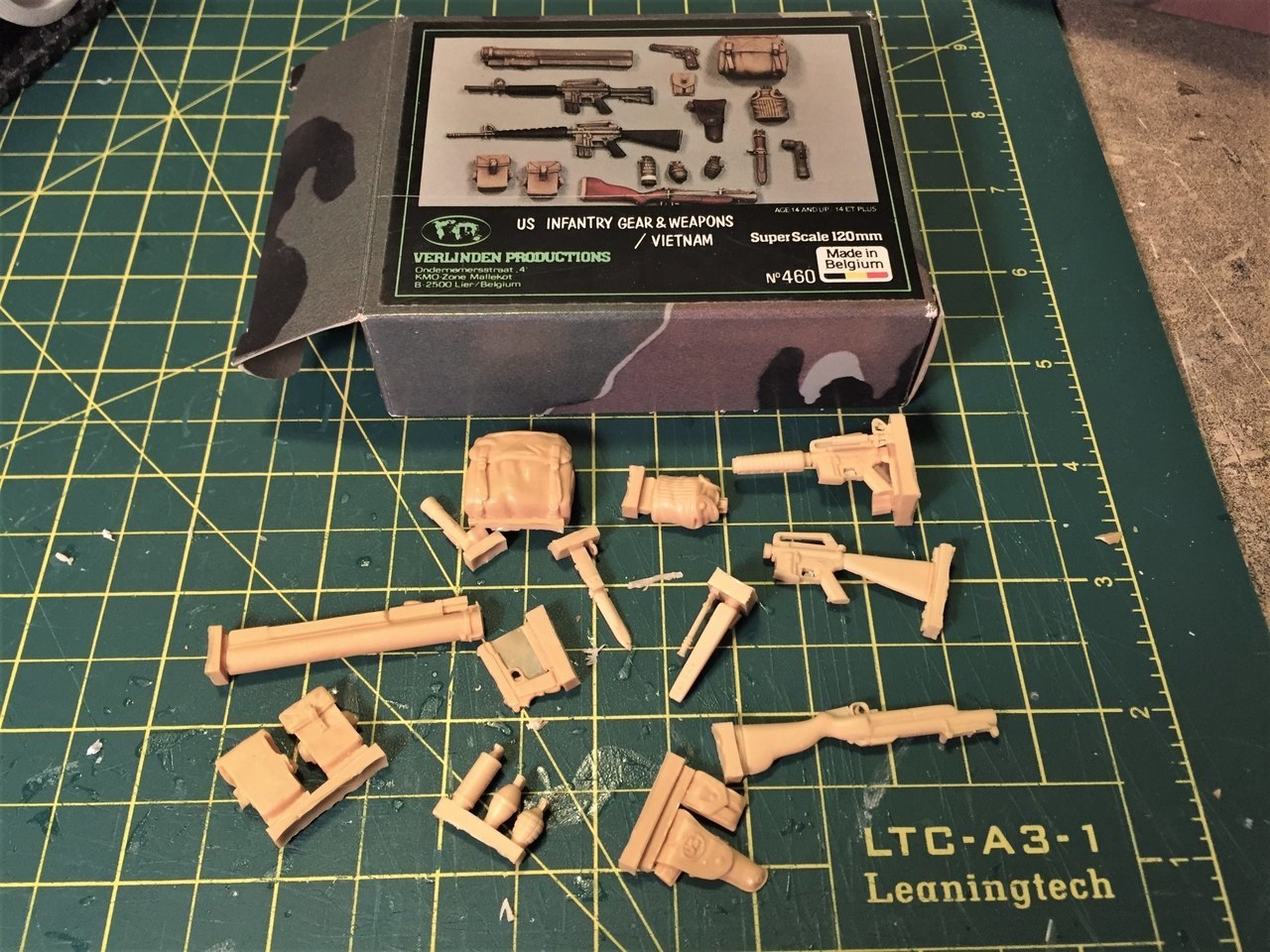 I had this in inventory for at least 15 years. It is Verlinden 460 US Infantry gears and weapons. Comes with M-16A1 and Commando version, an M79, pouches, grenades, flash light, canteen, knife, pistol and a rare M-72 Law rocket launcher.
