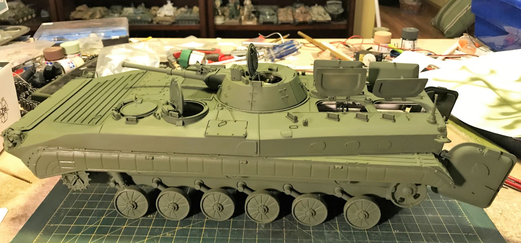 The BMP-1 is applied two Tamiya enamel coats as primer to seal the plasticard and putty, with sanding after the first coat to remove any scratch and glue residue that become apparent.