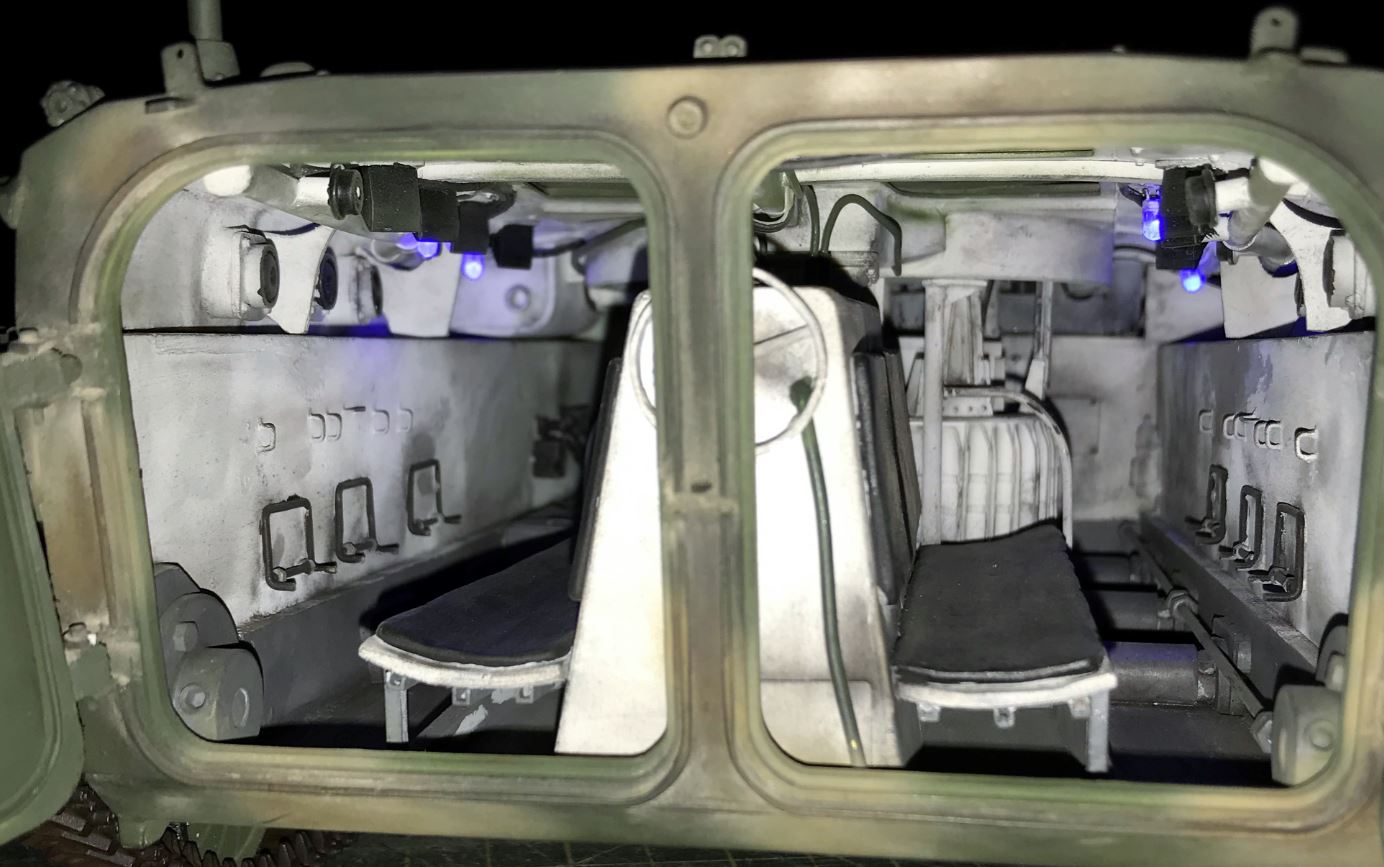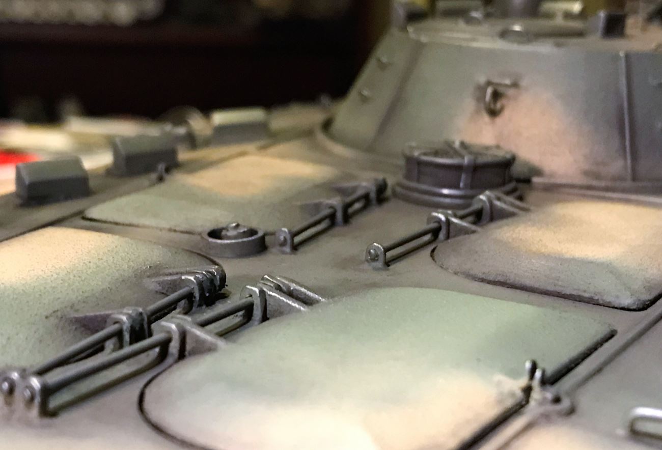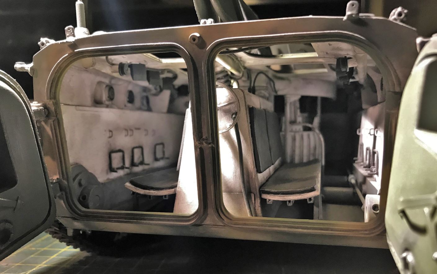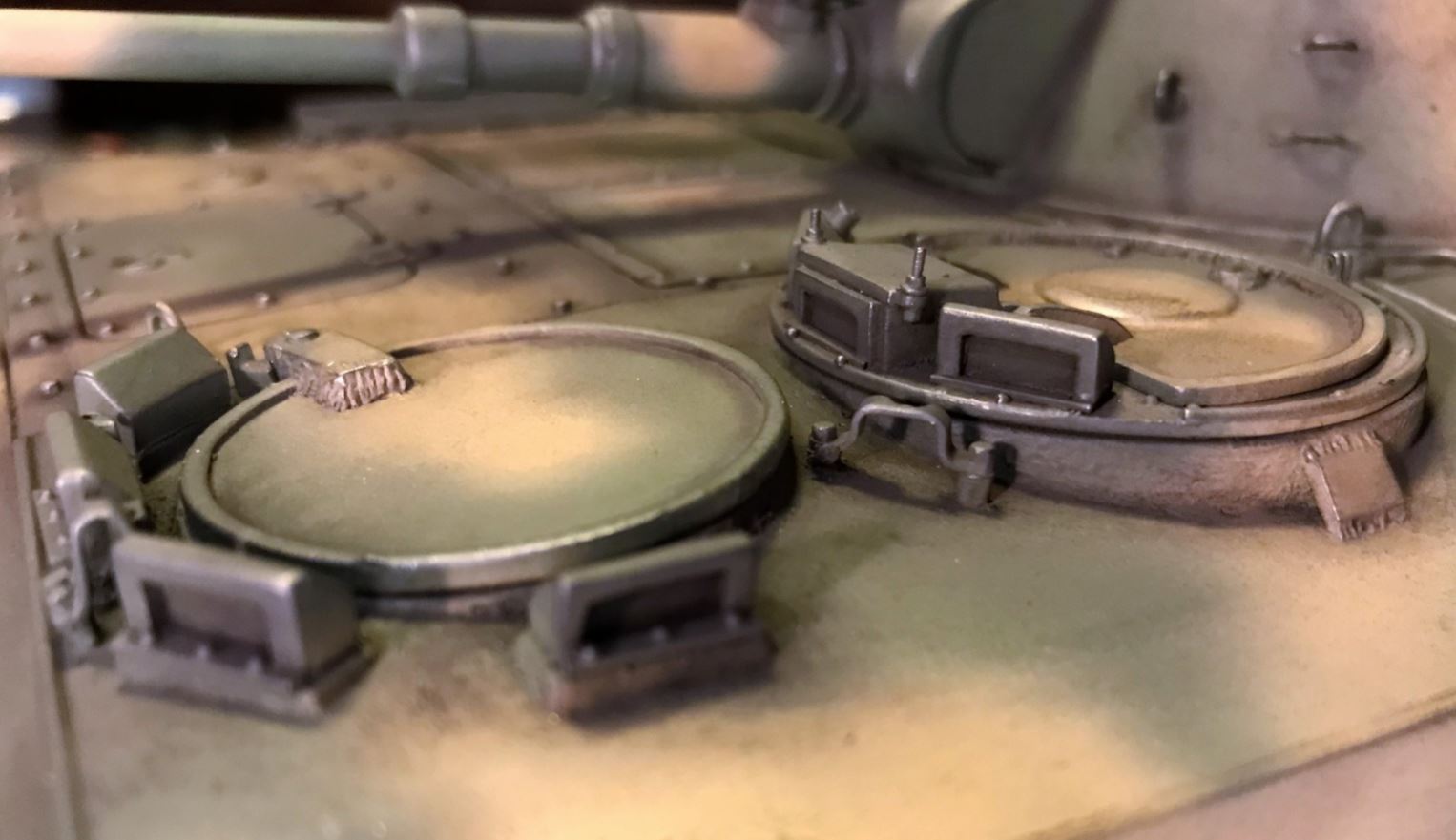 The interior has been finished in Tamiya flat white for the walls and roof, grey for the floor, and weathering with black pigments. I have seen many pictures of the turret basket in a colorful orange red. But I didn't know if this was for training purposes or also in the field. In the end, I decided against putting such color on my tank as I didn't think it looked good anyway.