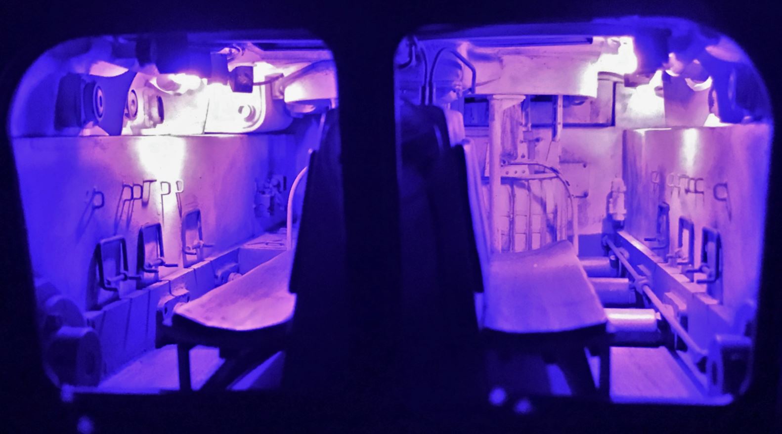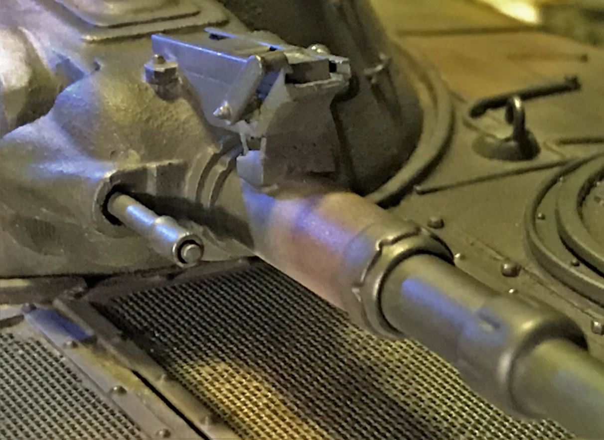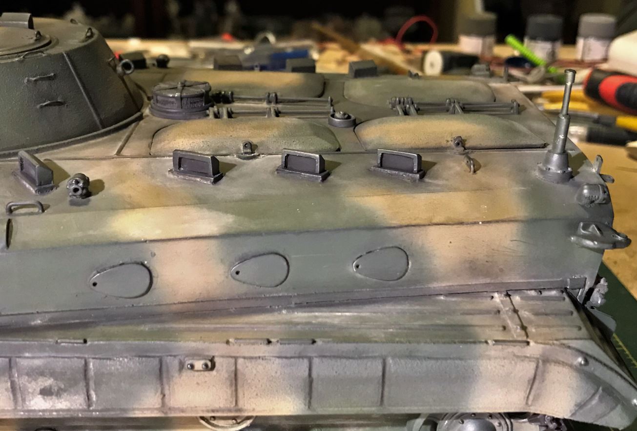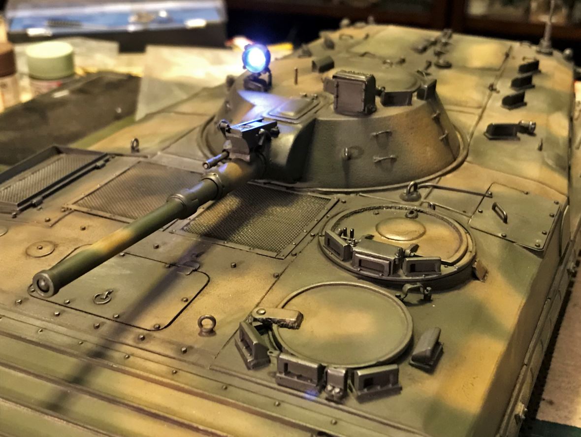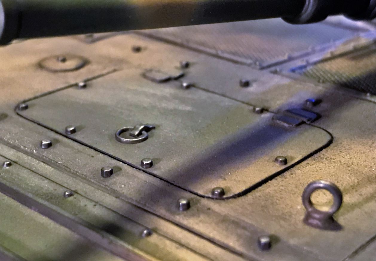 The interior has been finished in Tamiya flat white for the walls and roof, grey for the floor, and weathering with black pigments. I have seen many pictures of the turret basket in a colorful orange red. But I didn't know if this was for training purposes or also in the field. In the end, I decided against putting such color on my tank as I didn't think it looked good anyway.