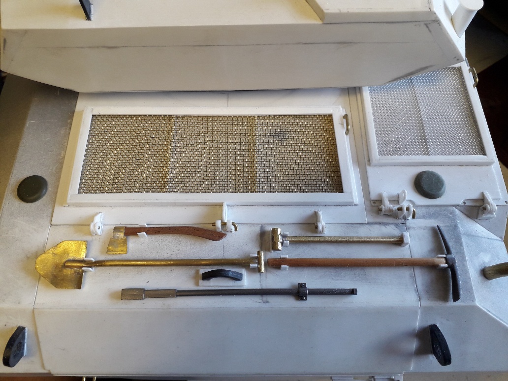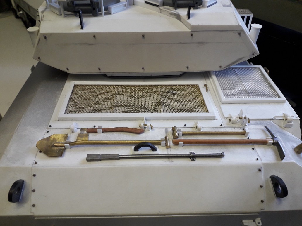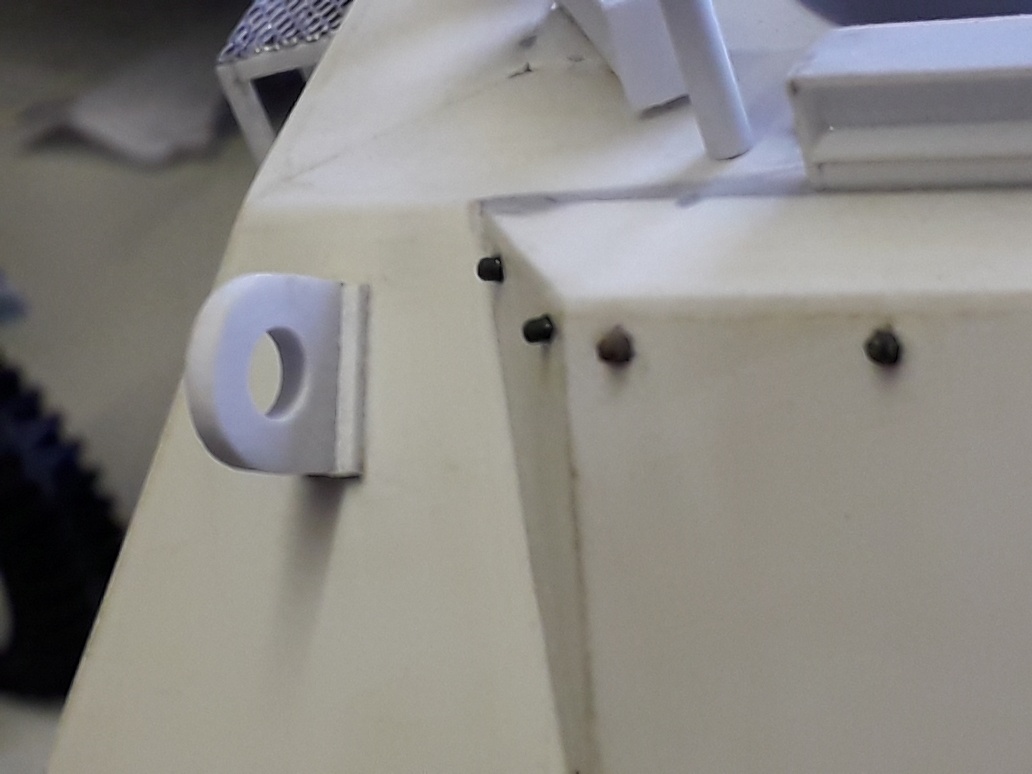 Got the tool stowage location brackets fitted to the hull, and made a start on the twin fuel tank filler caps.