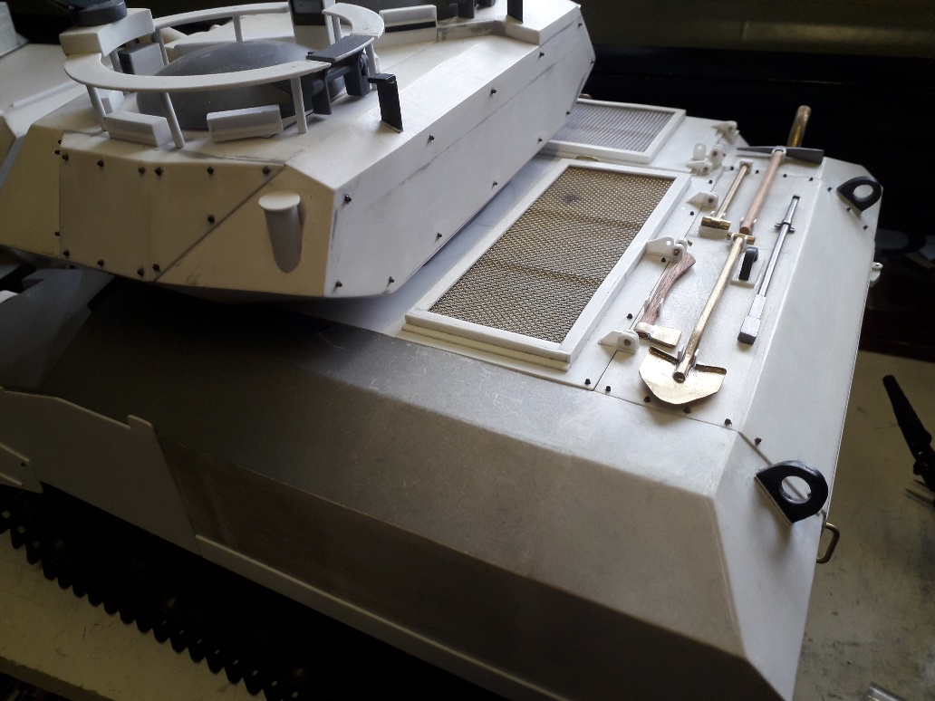 Added some more bolt patterns on the rear engine deck and rear of turret and a few more details on the sponson track extensions.