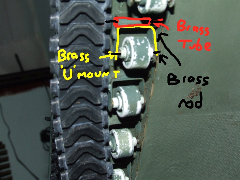 Basically the Brass plates mounted on the hull have a series of L shaped brass strips soldered to them to form a "U" shape. Each wheel has a slightly narrower Brass "U" cradle to hold it. This cradle has a Brass tube soldered to the top of it. The whole Wheel/Tube arrangement is then anchored to the Hull mount with a Brass rod through the L shaped bracket, through the tube and into the Hull. It was beyond me to make a suitable sprung suspension like Herman's as he did such a great job of his. So having tried I simply fixed the whole assemble in place again with solder. It works but in retrospect I think the brass isnt thick enough gauge and isnt resiliant to rough terrain and some of it is now deforming. Im thinking about doing an LVT 4 Buffalo but will work out a better suspension before I do it. Hope this helps mate