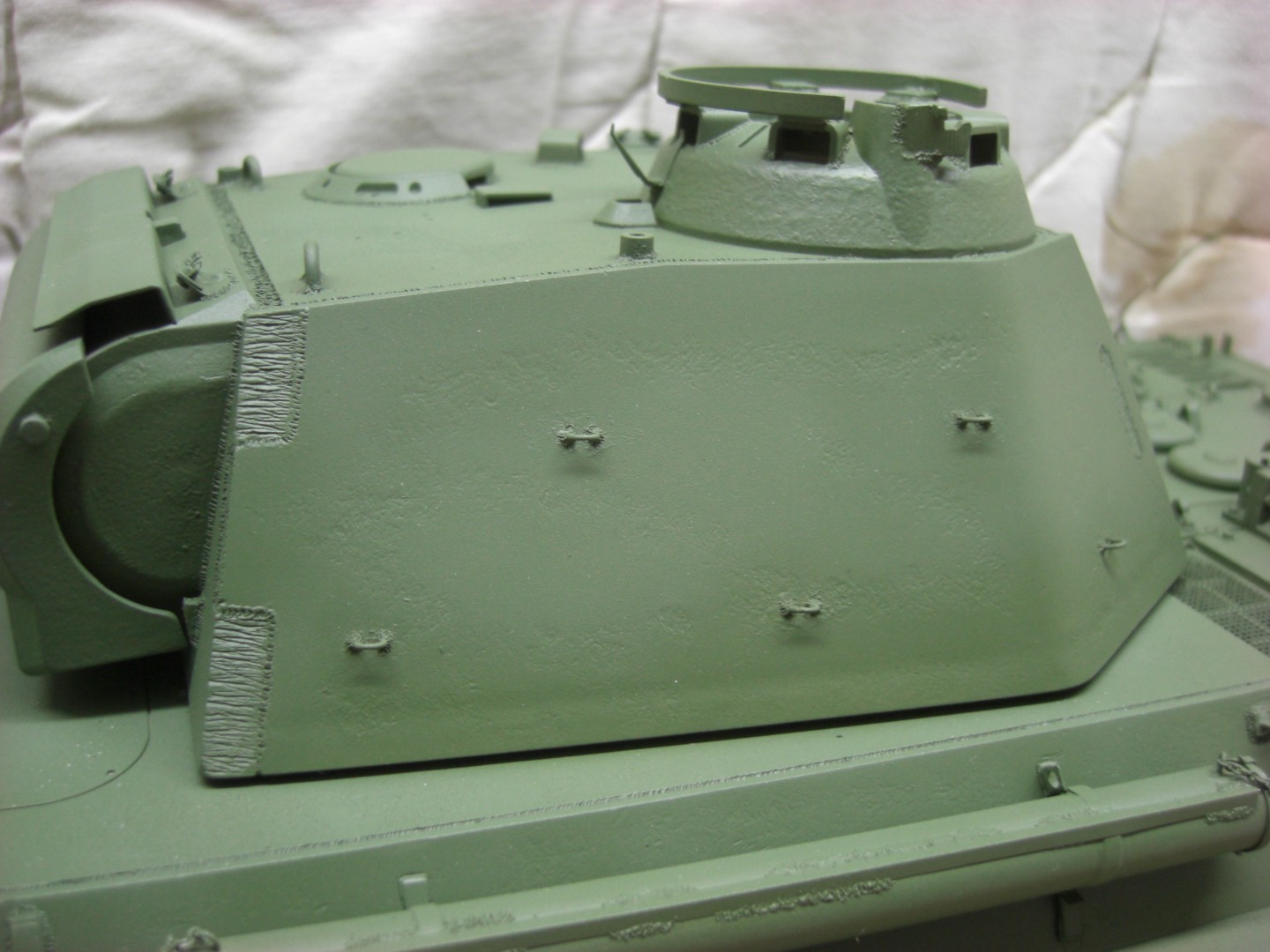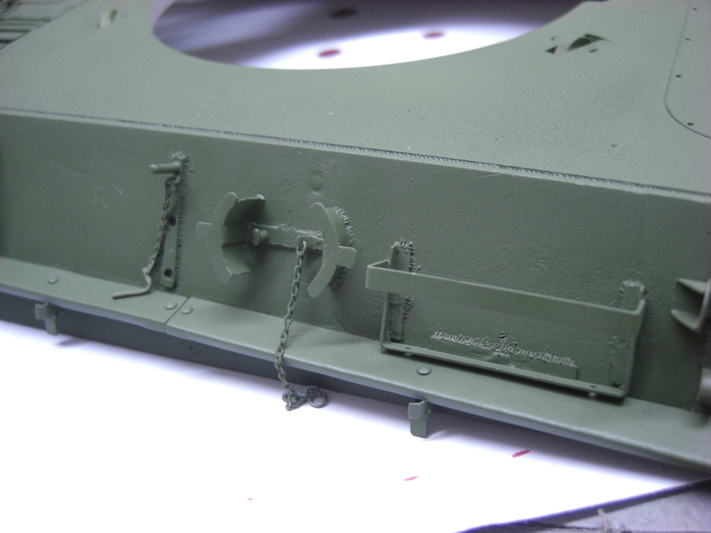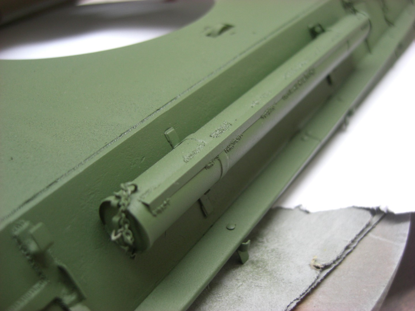 As I said, from the primer coat on my Panther I have no photos, only from the base color. The used base color was then and is now olive green (RAL 6003). This coat I've applied on my still disassembled tank. Here are some photos…