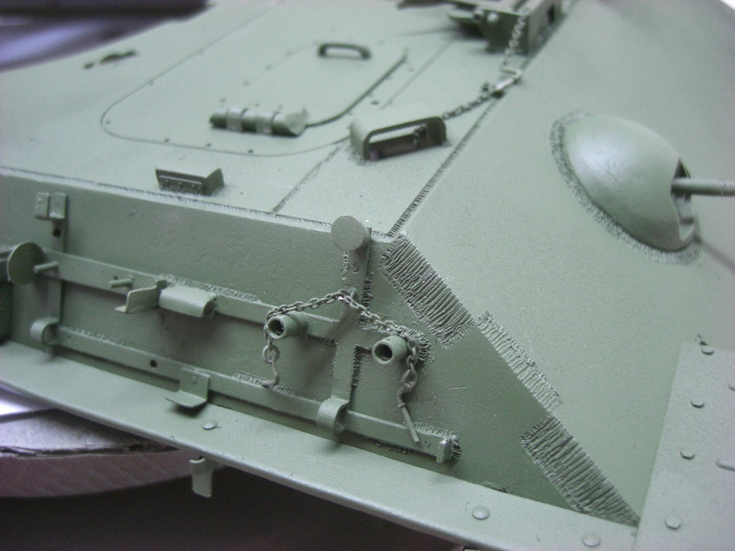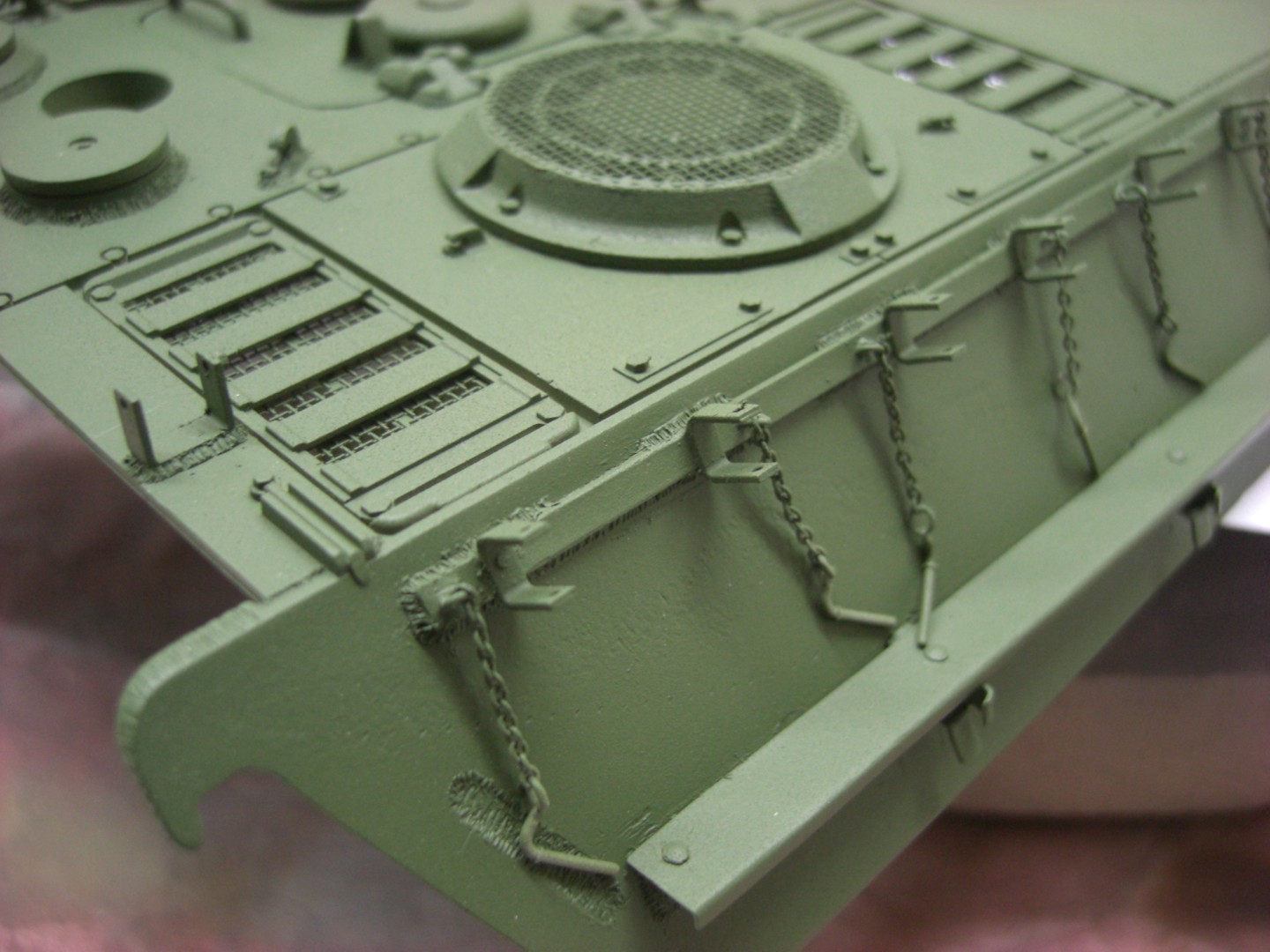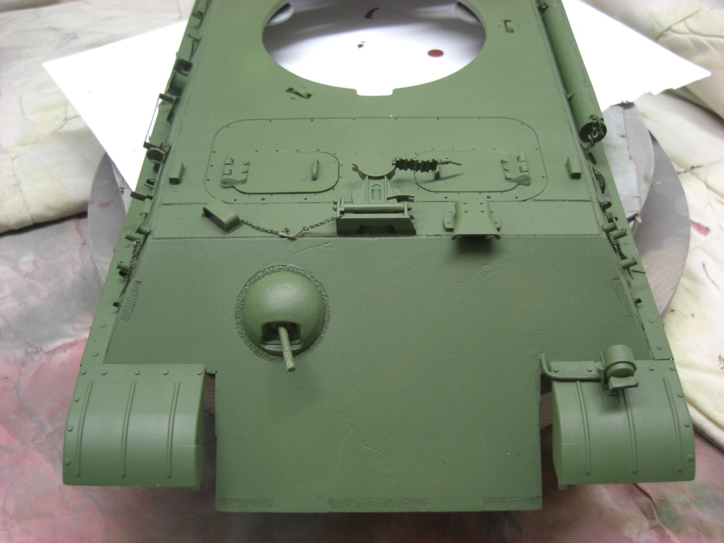 As I said, from the primer coat on my Panther I have no photos, only from the base color. The used base color was then and is now olive green (RAL 6003). This coat I've applied on my still disassembled tank. Here are some photos…