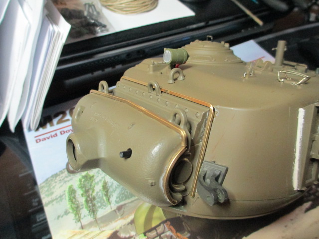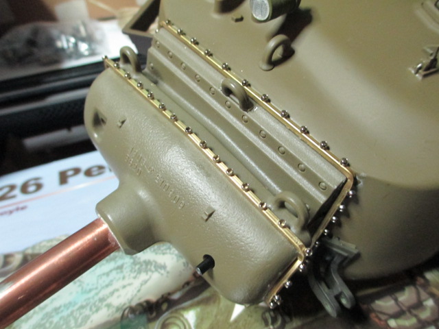 This evening saw the assembly of the mantlet canvas cover frame completed. I used 1/16 square brass strip and a pack of 2mm crimp beads to make a scratch version of the Schumo offering for the Pershing. It's not as elaborate or polished but am pretty pleased with it. The turret detailing is almost finished now. Just some loader hatch work and the Tamiya .50 cal left to do. Pictures: