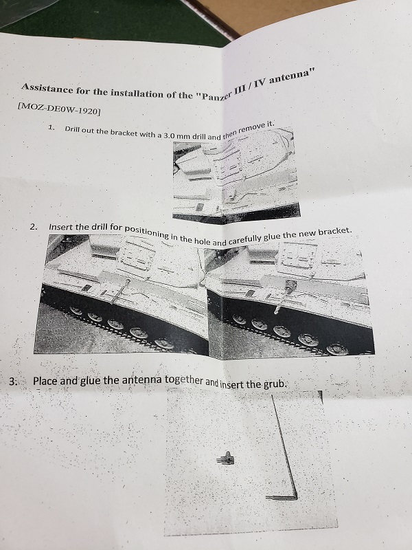 Tonight was supposed to be a simple install of the swivel aerial for the Panzer. Altho' made for the PanzerIII, this little kit noted that it would work with the HL\Taigen Panzer IV deck as well. Everything started well. Leaving off the big base designed for the Panzer III, the swivel of the aerial was nearly a perfect fit for the interior double wall spaces used on the Panzer IV. After the easy drill through of the wall and a test fit, things started going South. The 3D printed aerial shaft snapped at the shear point where the printed spring attached. Ok, I wanted to use the early type base provided with the HL Panzer IV parts anyway so some clipping and drilling later, I had a strong composite part constructed and was 30 seconds away from being done with the installation. Of course, tightening the grub screw that held on the supplied servo arm (that would allow for automatic aerial raise and lower) snapped off the shaft section protruding into the underside of the deck....I really cannot recommend using 3D print methods for tiny parts designed to move....The shear factor is too high. I cut a rubber section of tubing to use as a press fit sleeve for the remaining aerial shaft. It fit tightly between the under deck support walls and salvaged the installation. The aerial can be raised or swiveled back into it's trough. There is no left over shaft to attach the servo arm to but that feature did not figure largely into my build plans anyway. More fun to follow.