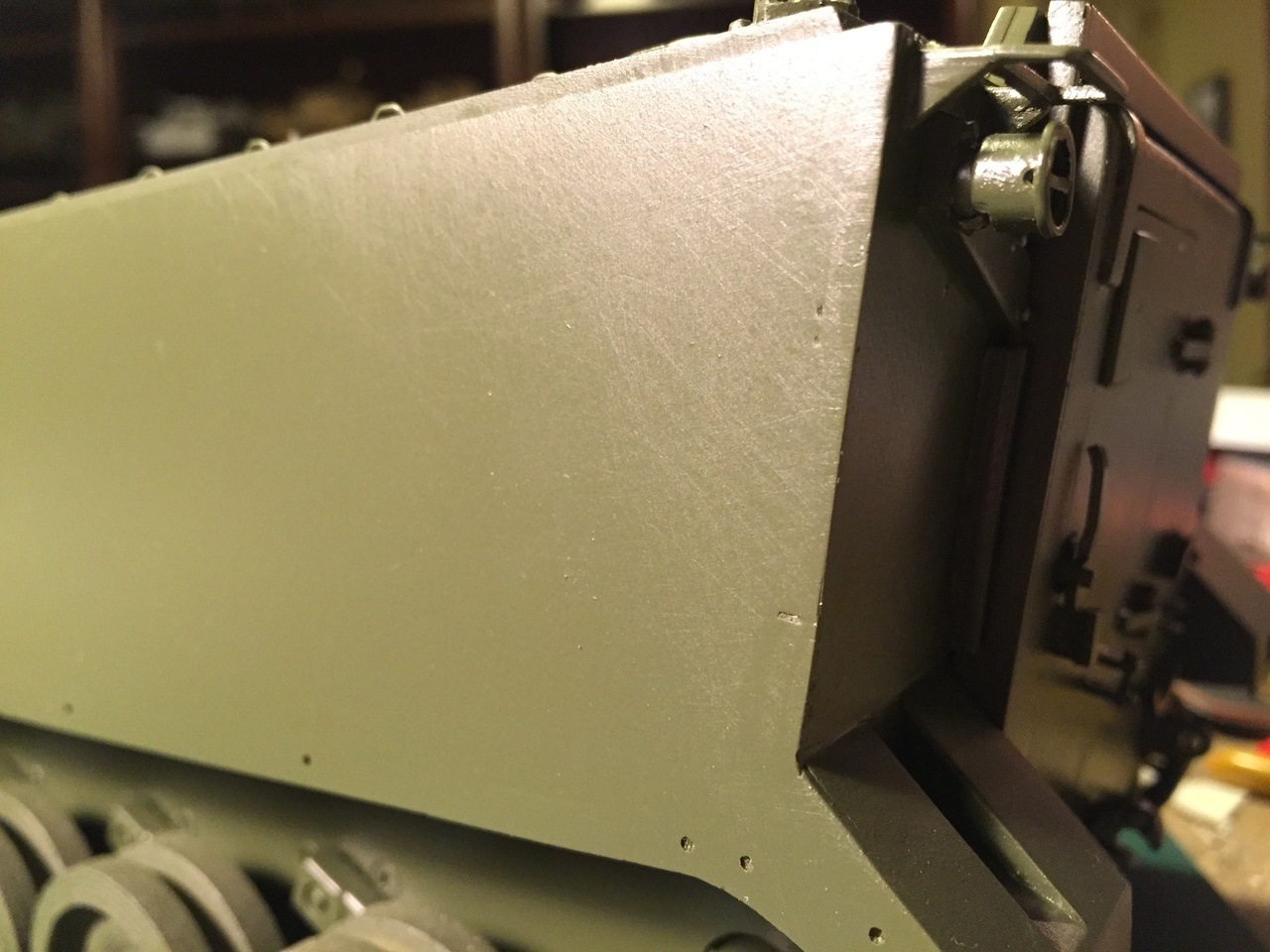 Here is the model after a Tamiya TS-28 Olive Drab enamel coat. I like to use enamel in cans for large surface because it is fast and the enamel seals the putty and prevent the oil in it from going through the surface and ruin the paint job. I am also always anxious to see the result of the first coat on a mostly scratch built kit. It was a relatively fast construction period (started October 21) so I expected issues to come out in the open and requiring corrections. At first sight, it is not too bad. My technique is to take close up pictures all around the vehicle and look at them on a big screen. It is easier for my 51 year old eyes to spot areas of improvements or fine tuning.