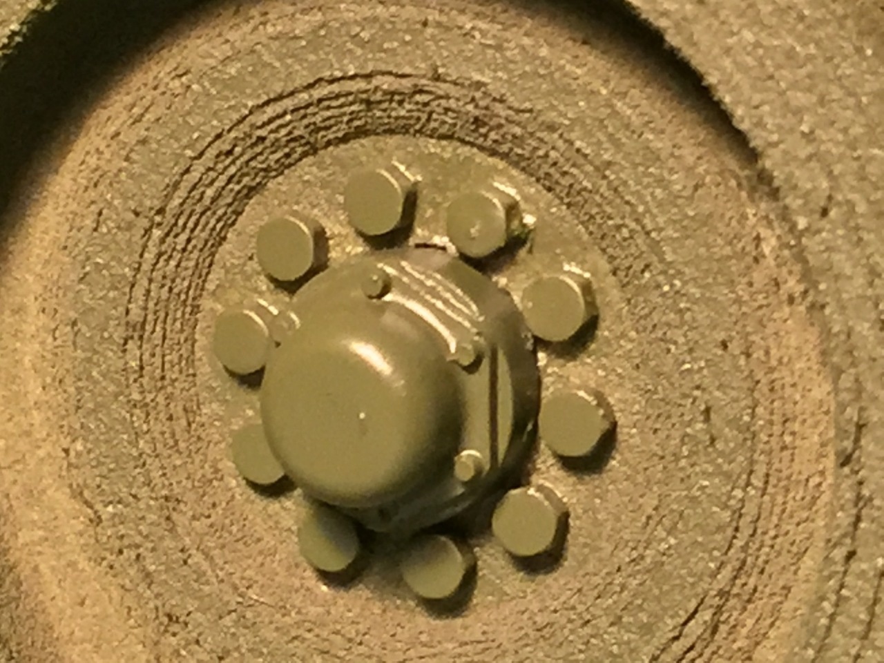 3D printed items can become an issue when their shape prevents sanding and polishing of their layered composition. I went too fast when ordering mine from Shapeways and I did not select the better but more expensive 'green polished' material. However, road wheel are not the main focus of this build. Seen here is the Tamiya 1/25 Centurion hub cap modified to fit the M113 wheel. Not ideal but I did not find better alternatives. Pershing or M41 hub caps are way too big for the M113 road wheel, believe me, I tried.