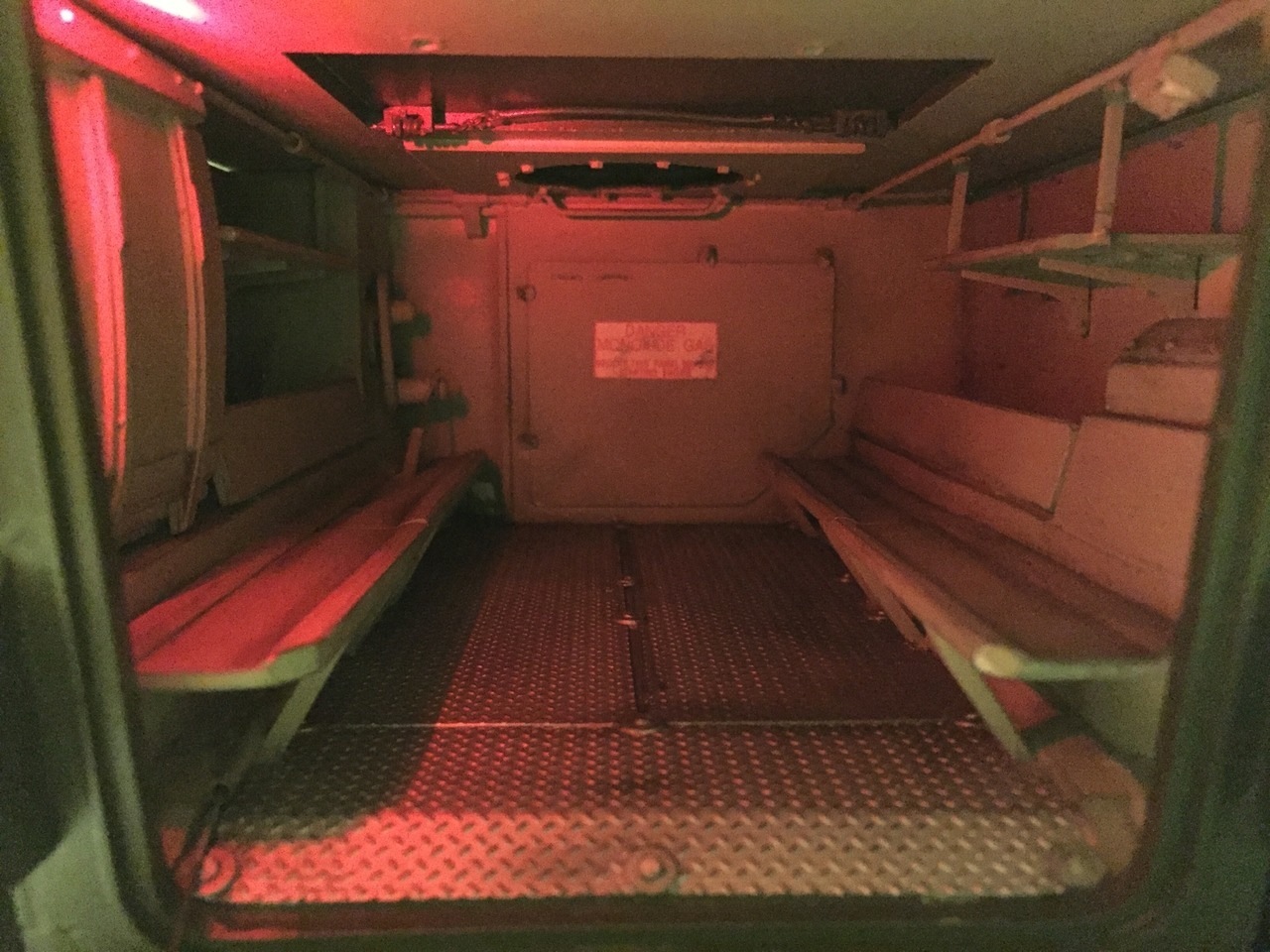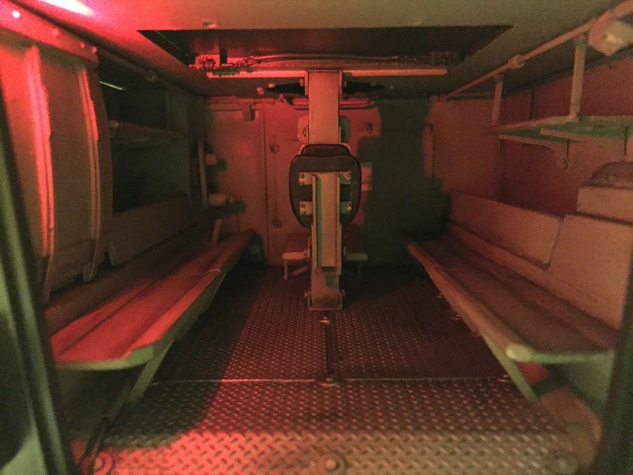 The interior with night light on, without central console. You can notice the locking mechanism for the roof trap on the ceiling. I am noticing a few things to correct through.