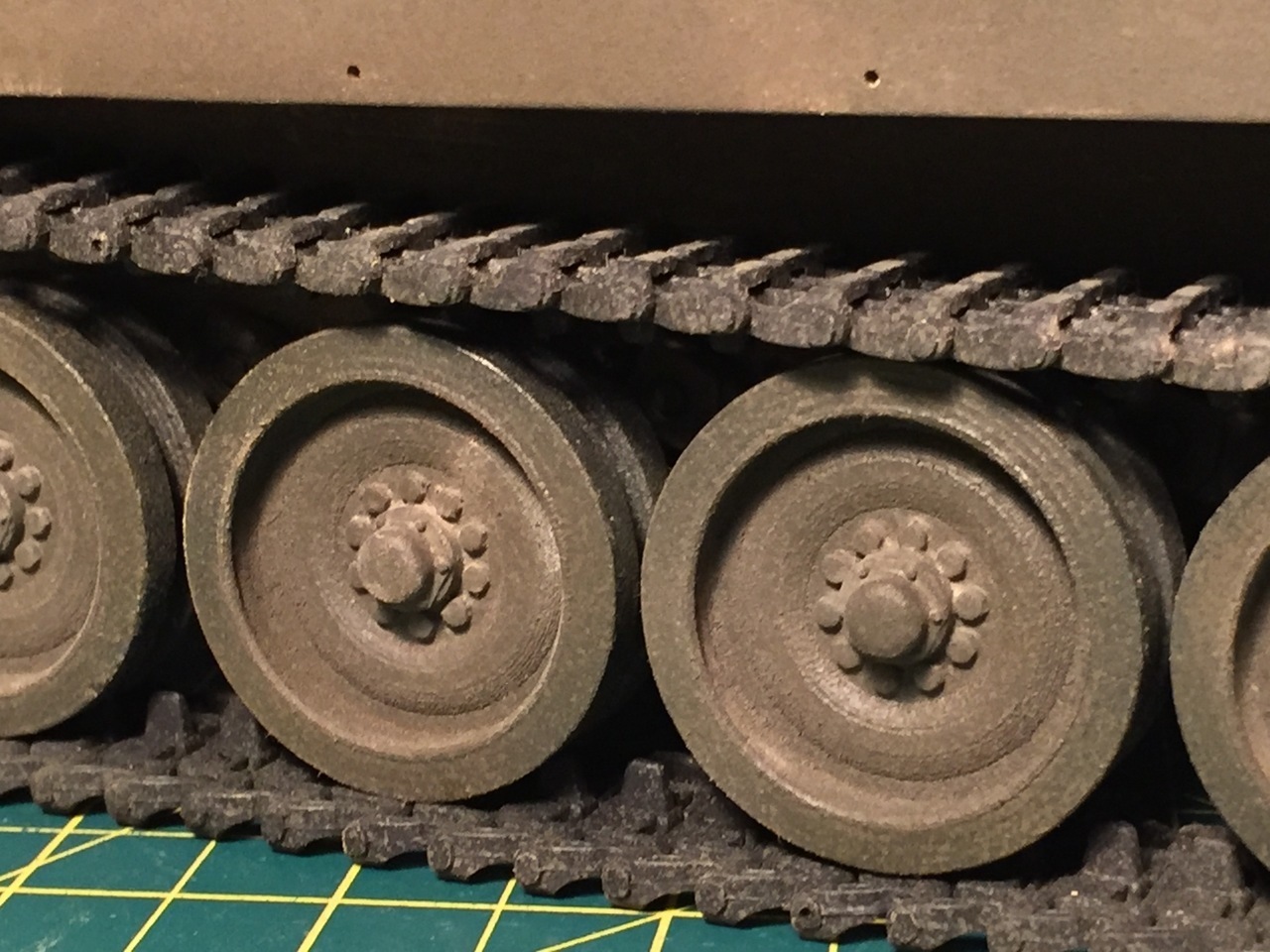 The model is cleaned up, polished and another coat of enamel primer was applied. The road wheels were sanded the best I could and look better now, unless you put the camera 1 inch from them. The model is ready to be given light undulating coats of OD acrylic to remove this shiny new look and create a weathered tank.