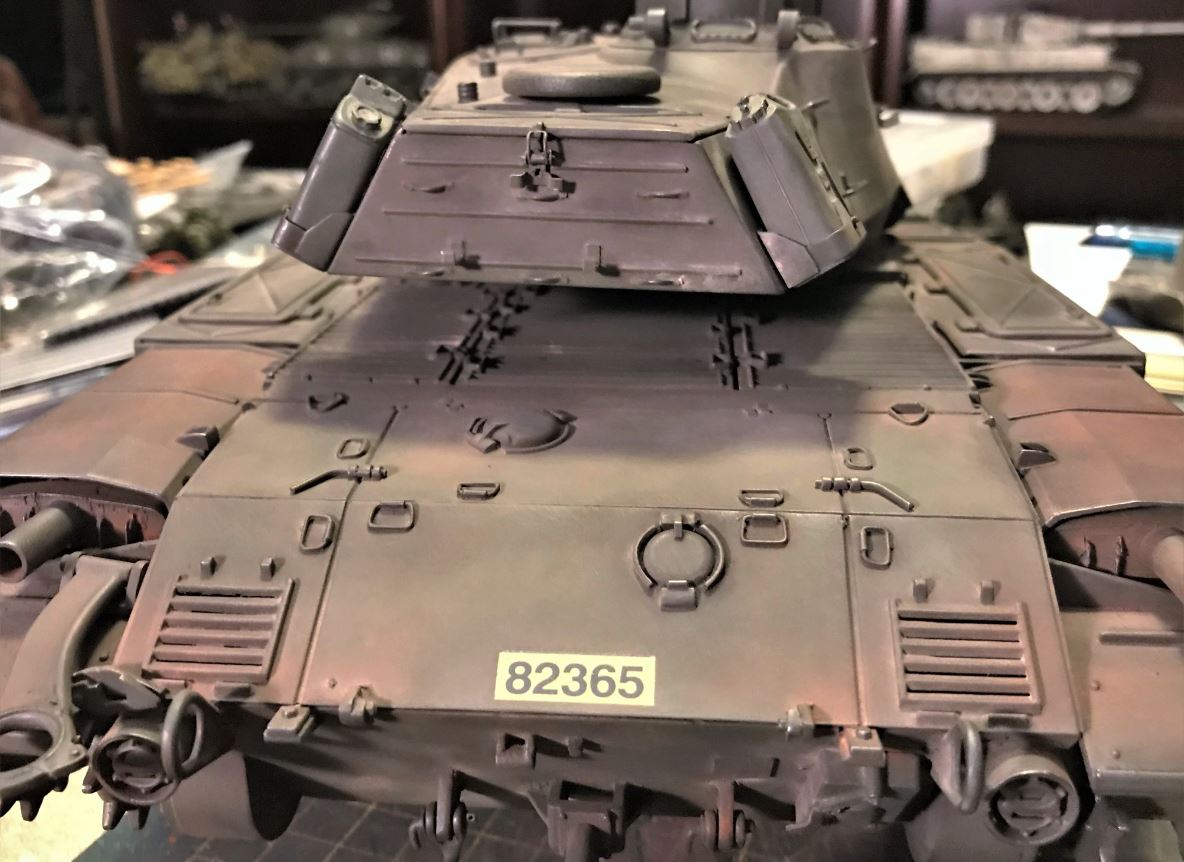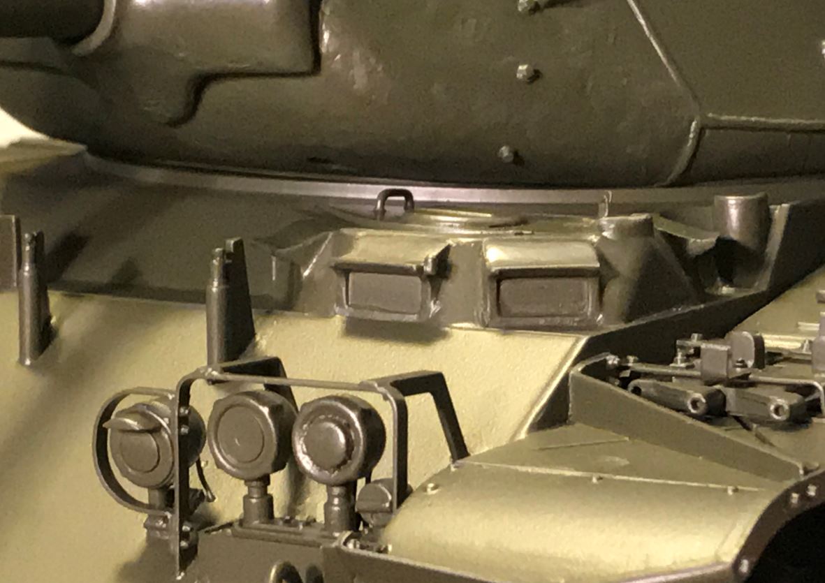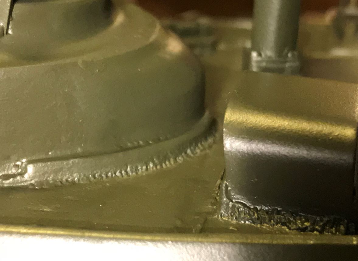 The nose of the production M41 turret is cast, while the rest of the armor are rolled steel plates. It is important to show the demarcation and the different feel on both sides of the weld connecting the two. The light cast effect on the nose was done with superglue applied directly on the part, then sanded a bit. Also noticed that I have sealed the joint with putty between the top and bottom parts. Yes, if something goes wrong with the electronics inside, I will have to crack open the turret and redo the painting there. But this is nothing compared to seeing the turret split in half for the next decades, in case something happens.