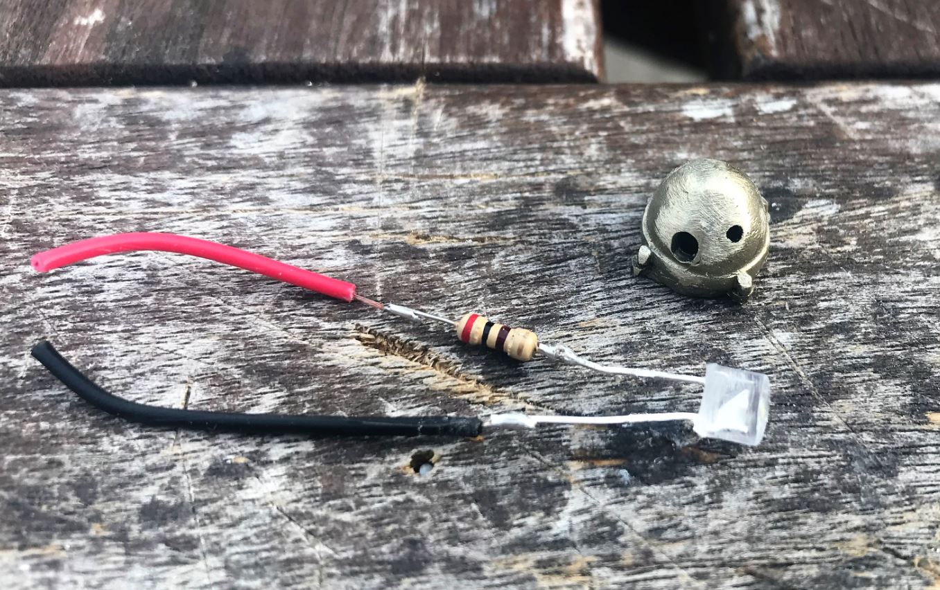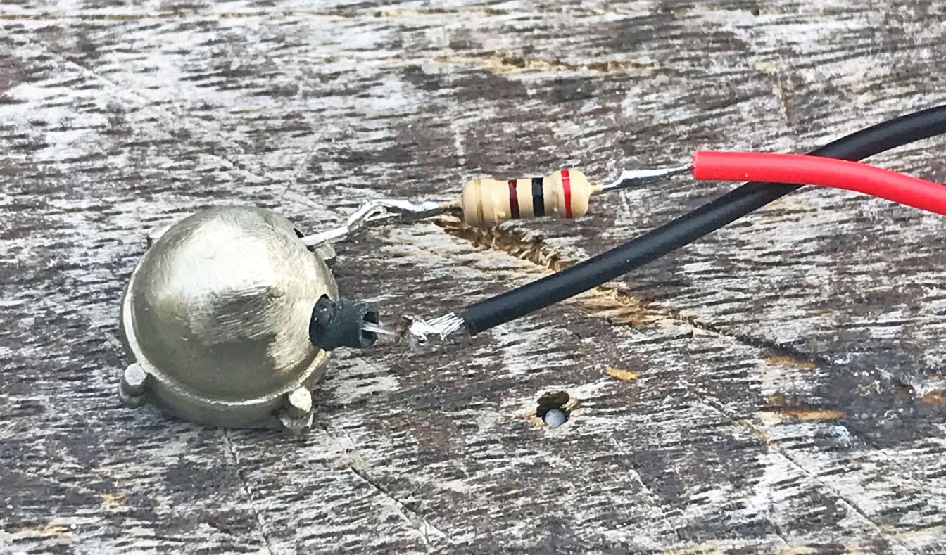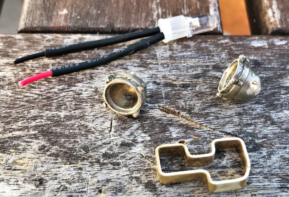 The LED is modified and sanded to reduce its length so that it will fit inside the metal headlight.