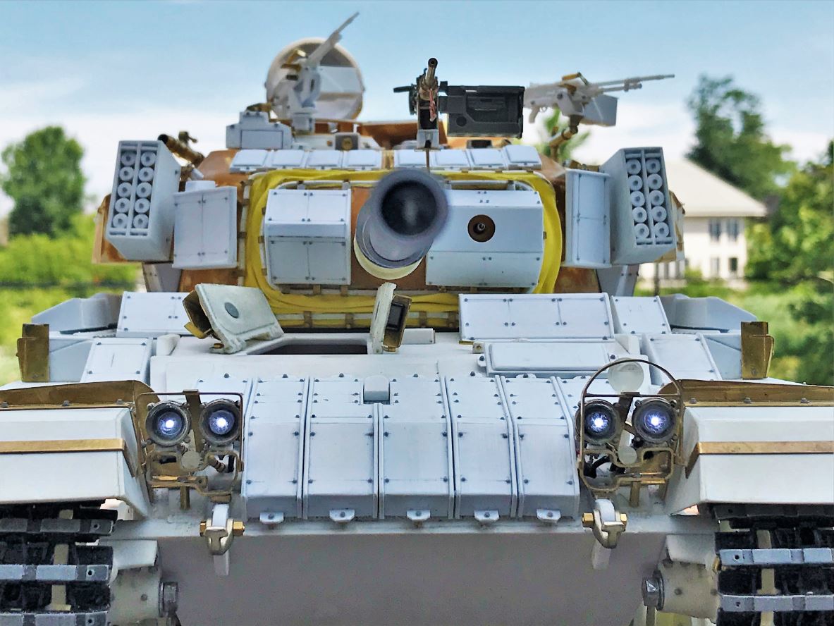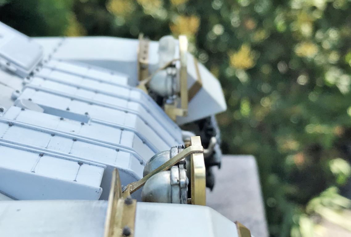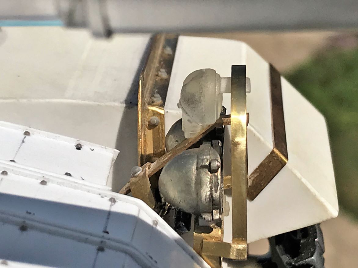 All the wires and connections are in a dark pit between the headlights and the ERA block. They are somewhat hidden under the guards and are noticeable only on close ups. Someone with more patience could look for ways to mimic the real cables. My style is to spend more time on items that really show.
