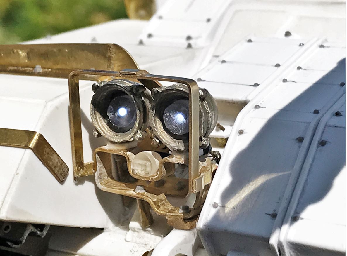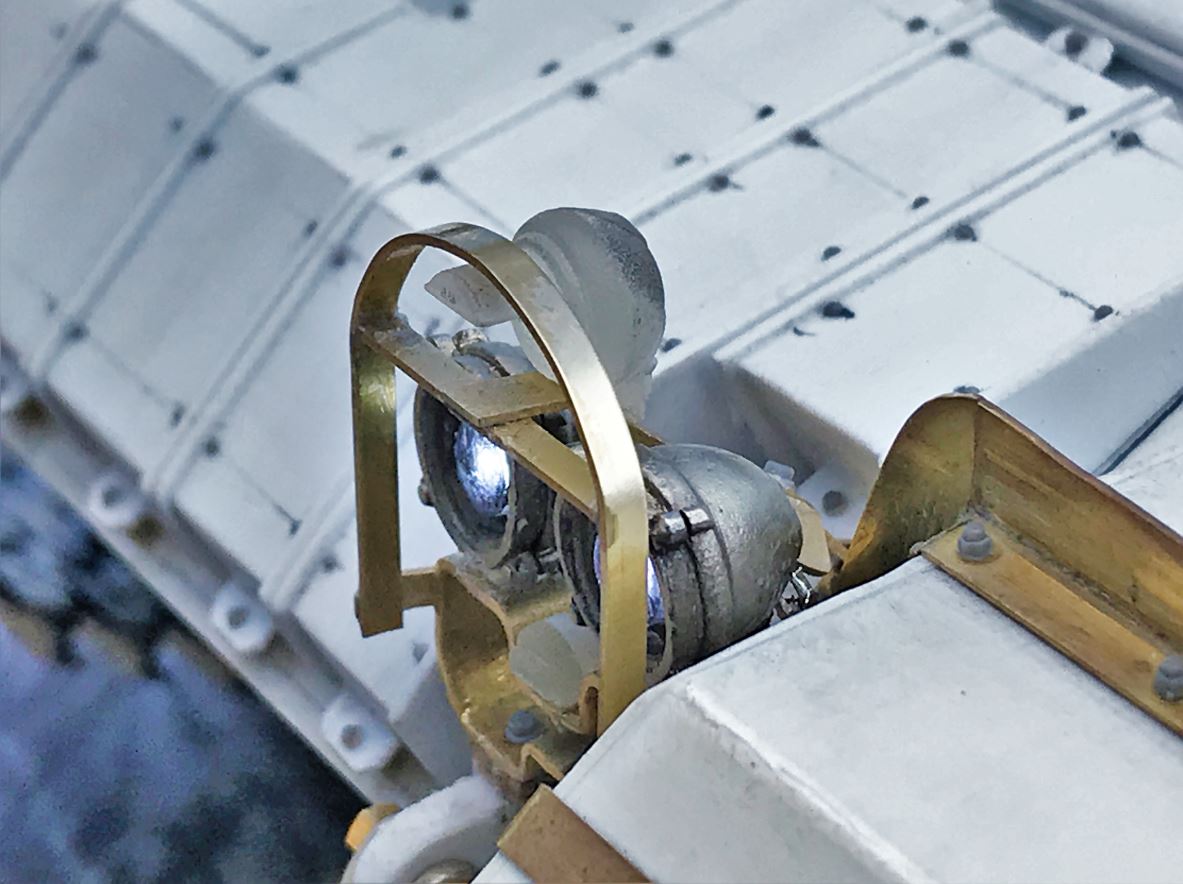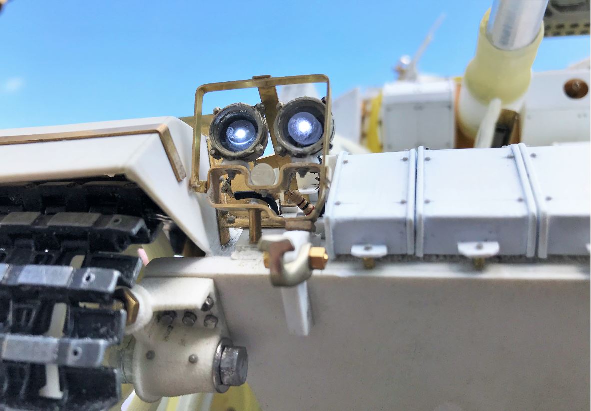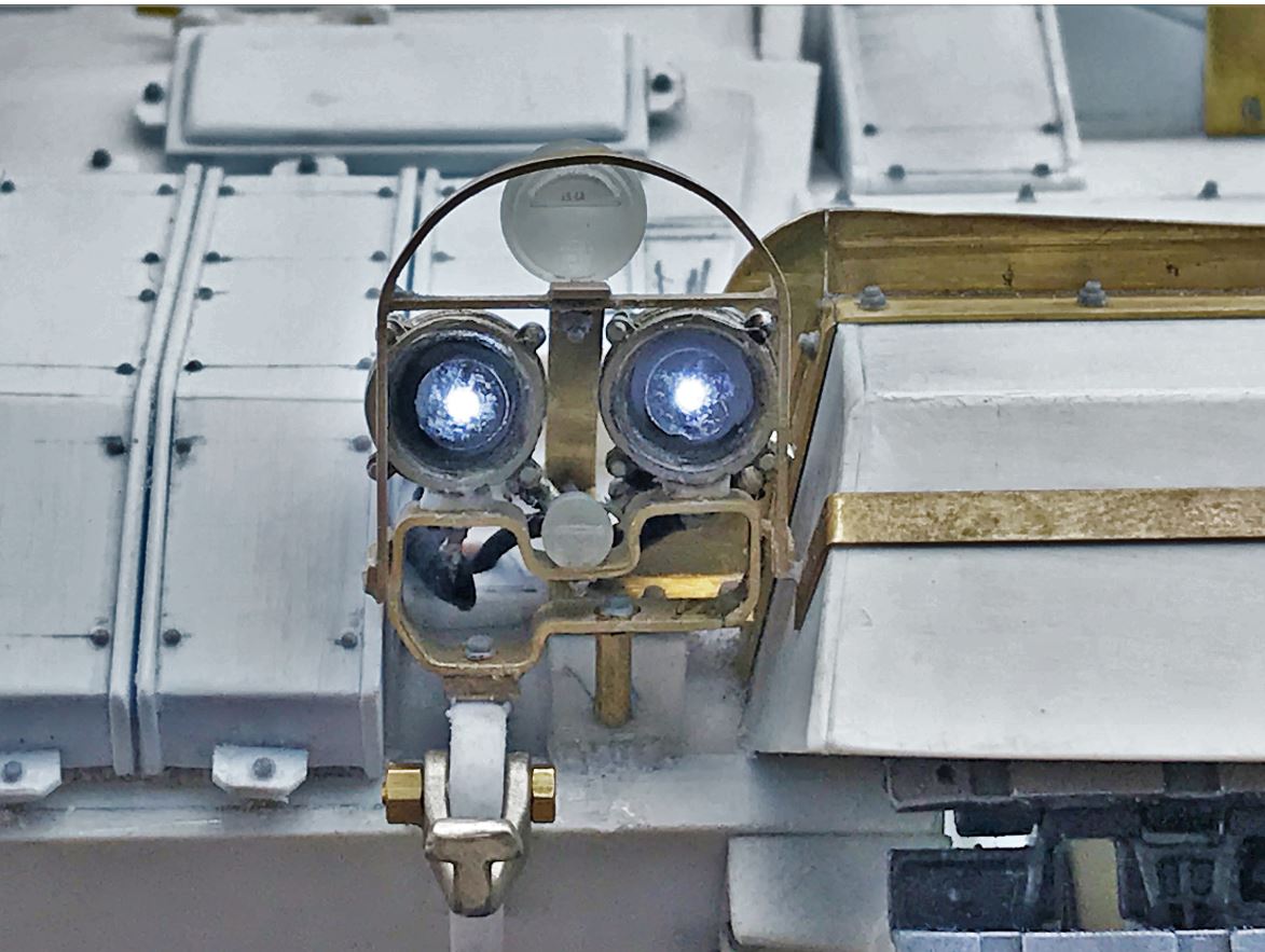AFV-Model T-55 metal headlights are used, they are close to the required model. I used 5mm LED kits from ebay purchased for a few dollars. The mount is made in brass by hand with a couple of pliers, nothing more. Not perfect, but I only have basic tools.