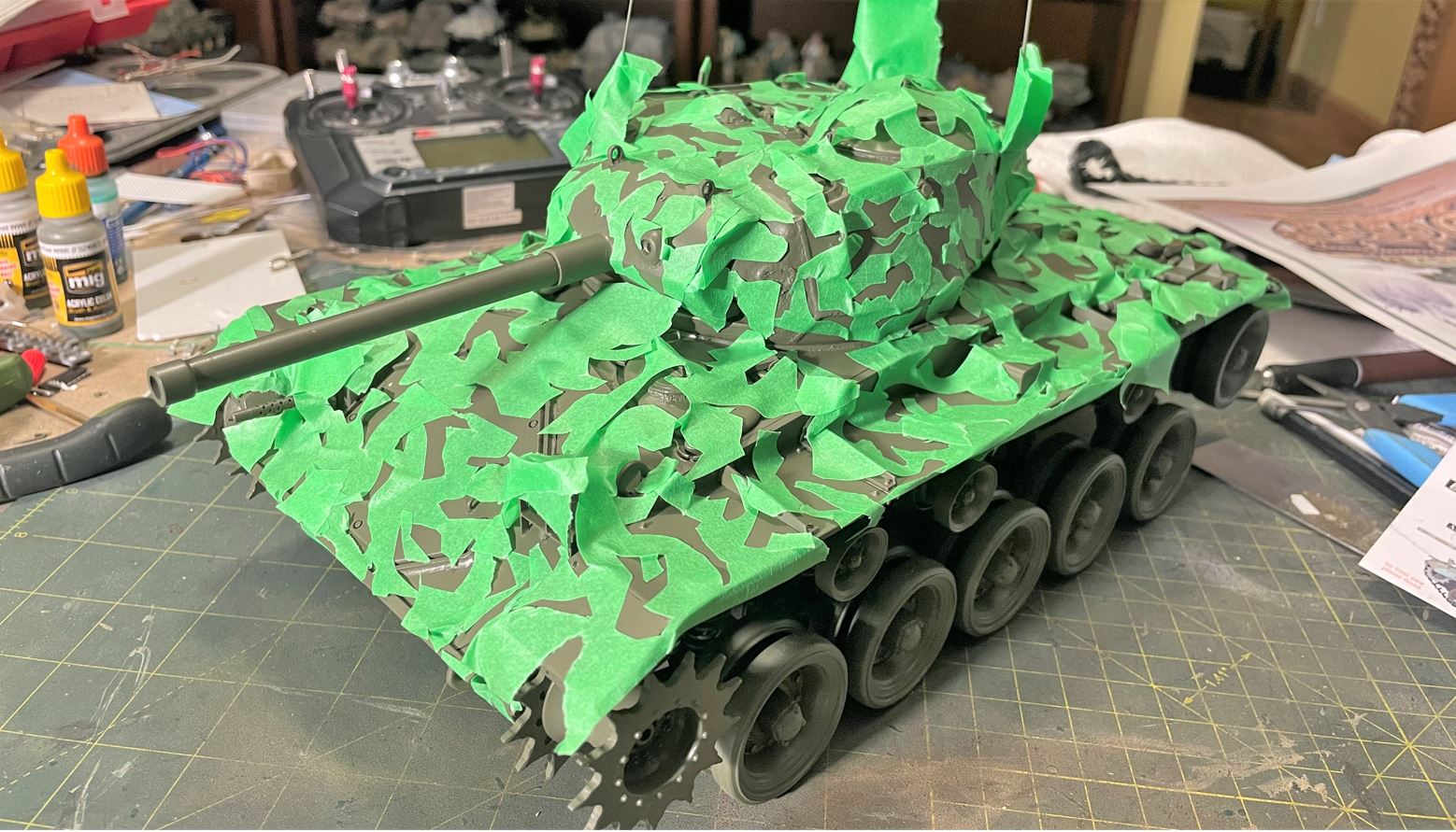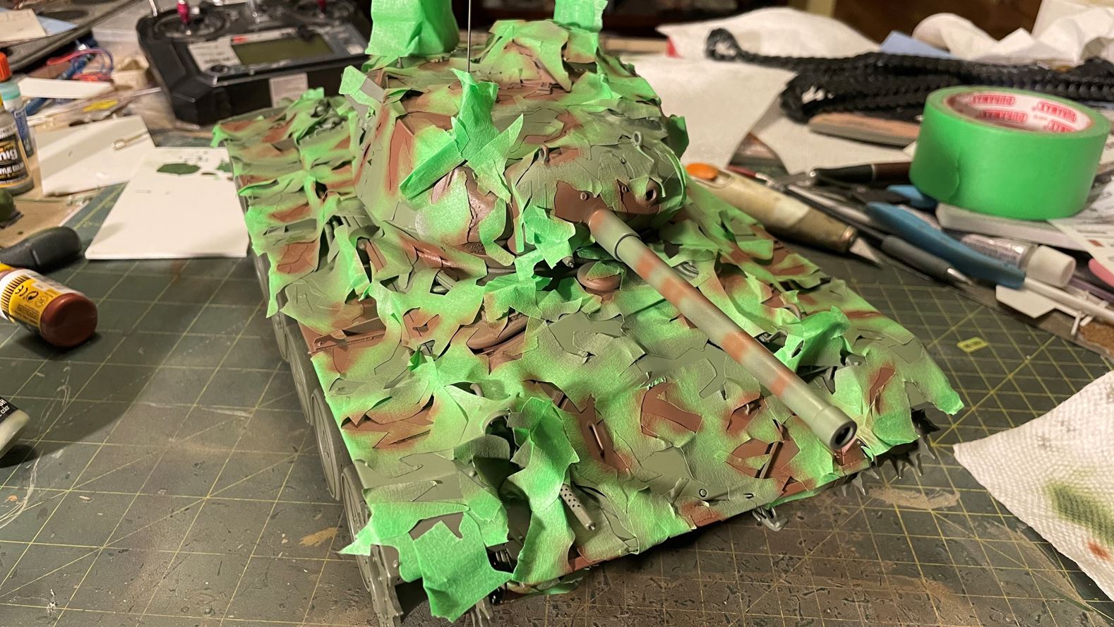 All the masking tape is in place. This method also allows for the camo pattern to be reviewed and re-arranged as required before painting. Scary process.