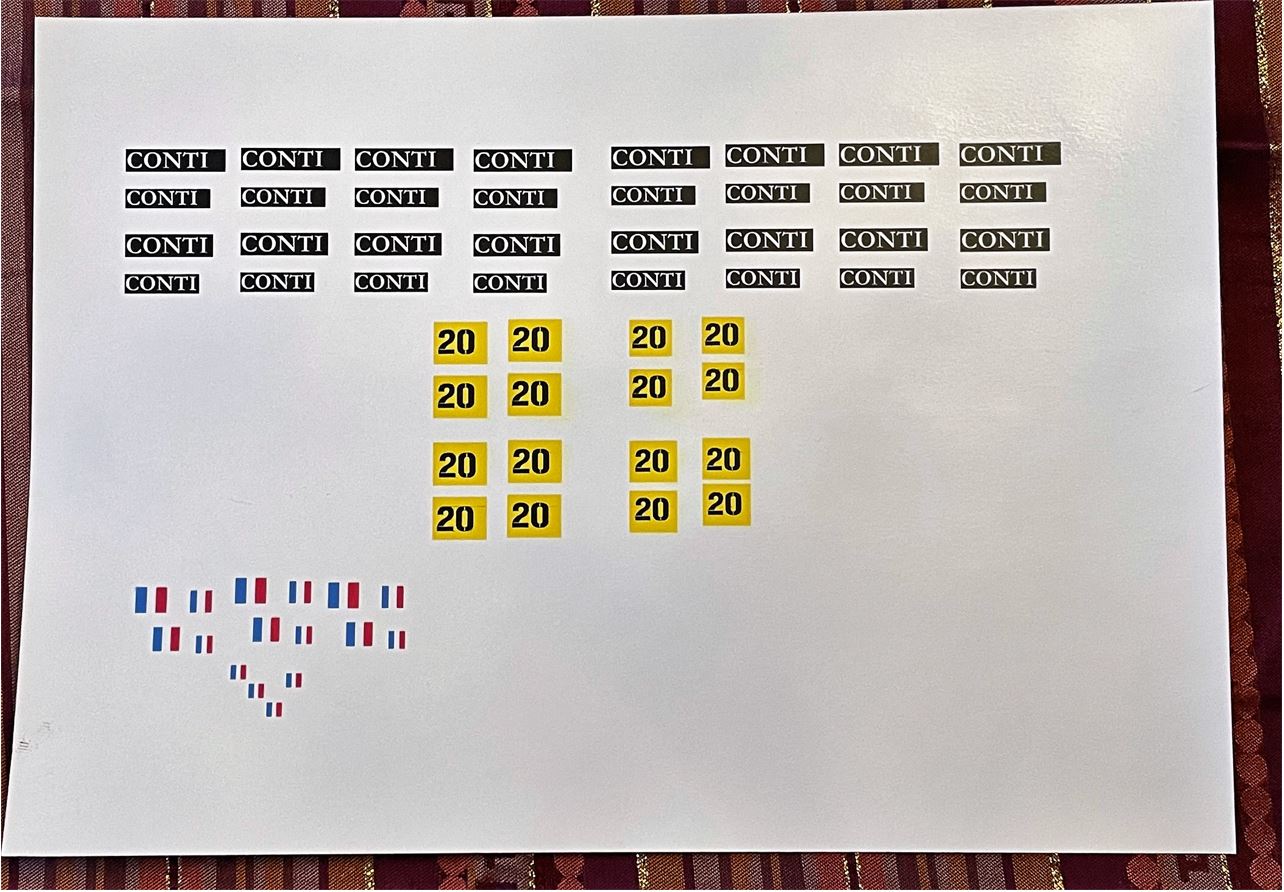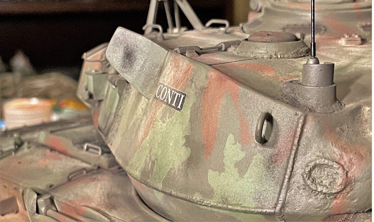 Before weathering, i needed to put on markings. Forget about finding 1/16 scale decals for Conti on the market. I had to design my own 1/16 Conti decals using Powerpoint first. I did download some military fonts that allow more custom letters font than an office presentation would have required with this simple software. The decals themselves are easy to recreate because they are simple boxes with letters and colored fills. I put at least two sizes of what i needed, to select the best size. Lots of extras are needed with these home made decals because some would not be cut correctly, or could break or lose some colours if not manipulated with extreme carefulness. One decal took 4 attempts. The decal sheet is then printed with the inkjet printer on a virgin white decal sheet that can be purchased on Amazon, a tip from Snipermadrid for which i am very grateful. After letting the ink dry for a couple of hours, a Tamiya semi gross varnish enamel coat is then sprayed over the decals paper sheet, and let to dry overnight. The decals are cut and applied on the tank the following day. Take note that this process can only create white letters if they are surrounded by a colored background. My printer does not print white so it is the white virgin sheet that shows for all the white. For pure white letters decals, these need to be purchased unless you buy an expensive inkjet printer that can print white.