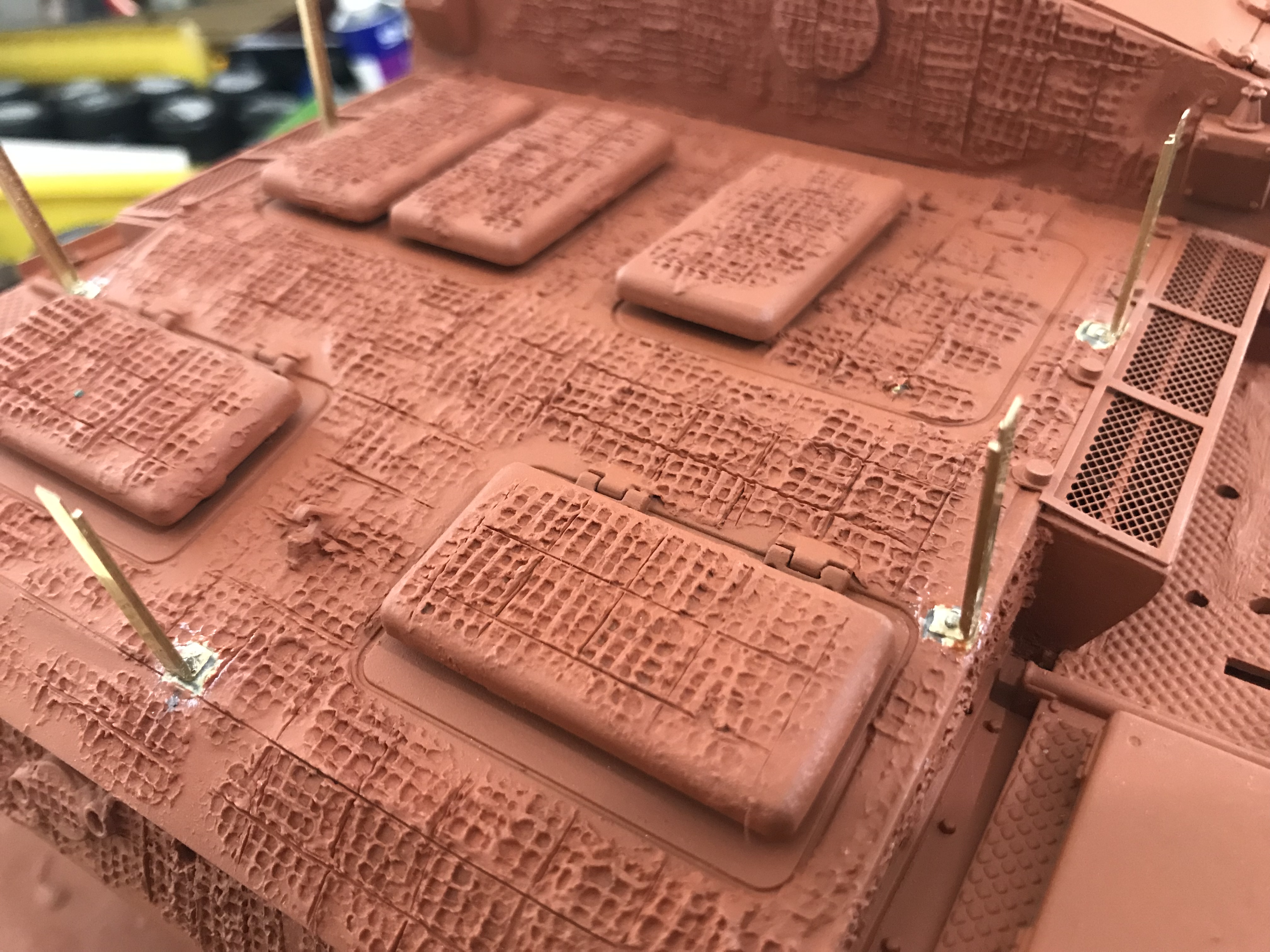 Altered the HL spare wheel mounts that were on the rear deck to take a couple of Mato metal spare wheels now relocated to the front guards.