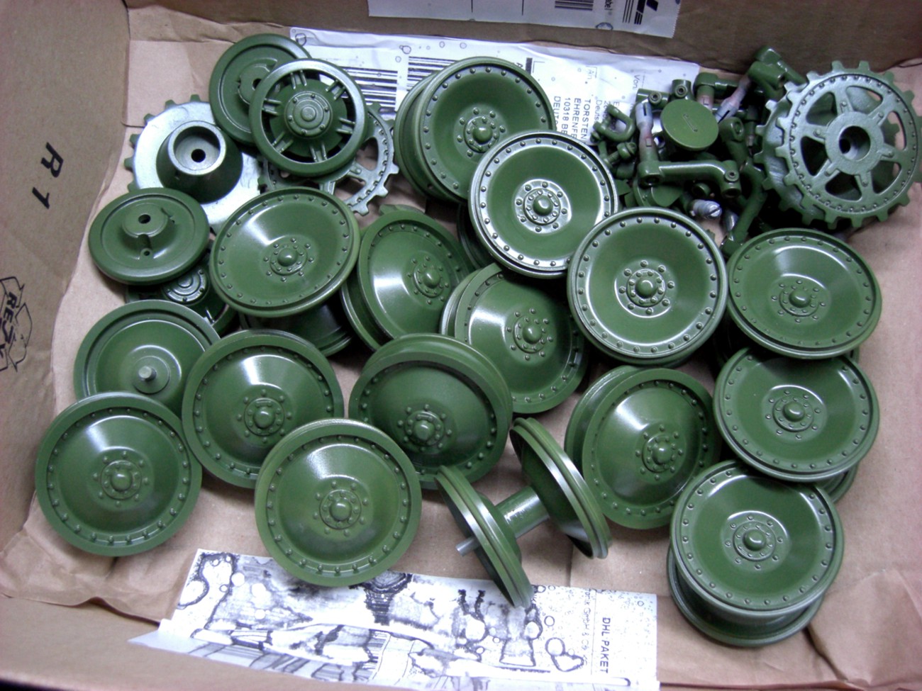 All parts have now received their base coat of olive green. Only vertical plates receive the camouflage pattern, so I can now begin to finish the road wheels, suspension arms, sprockets and idlers. First they get a coat of glossy lacquer.