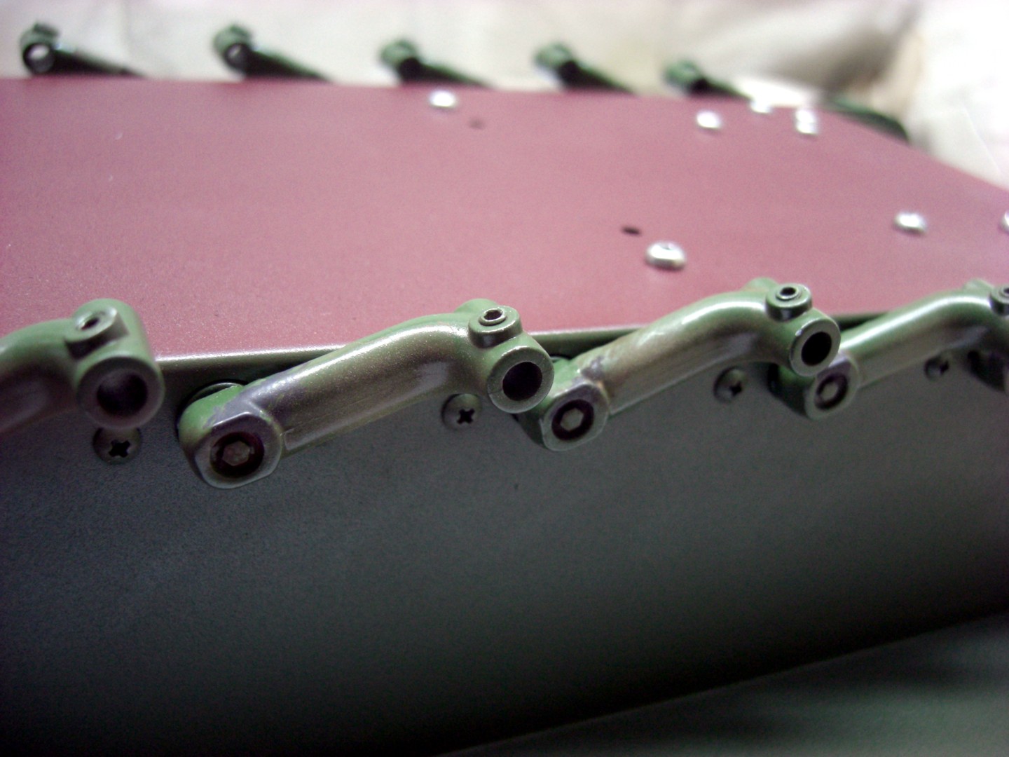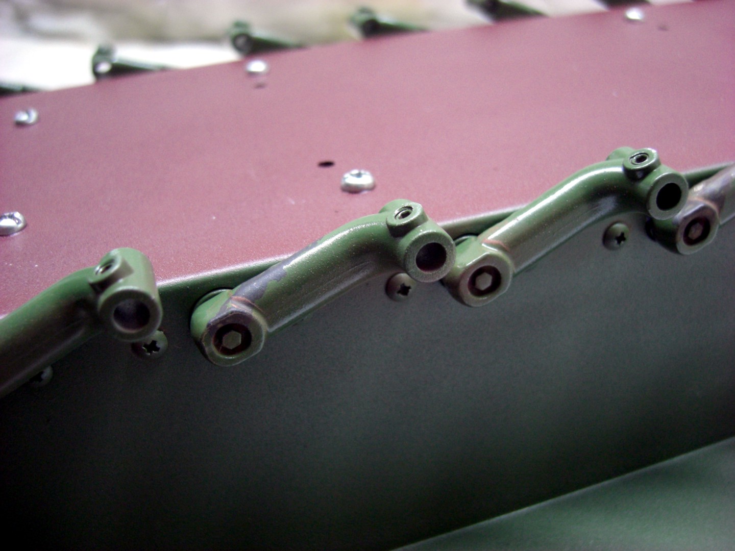 After this hard work I began to assembly the lower hull, torsion bar stays, torsion bars and suspension arms were mounted. The bottom of my lower hull is only painted in red brown, the german anti-rust color. Later barely to see; also a few suspension arms have received some little stains and runners.